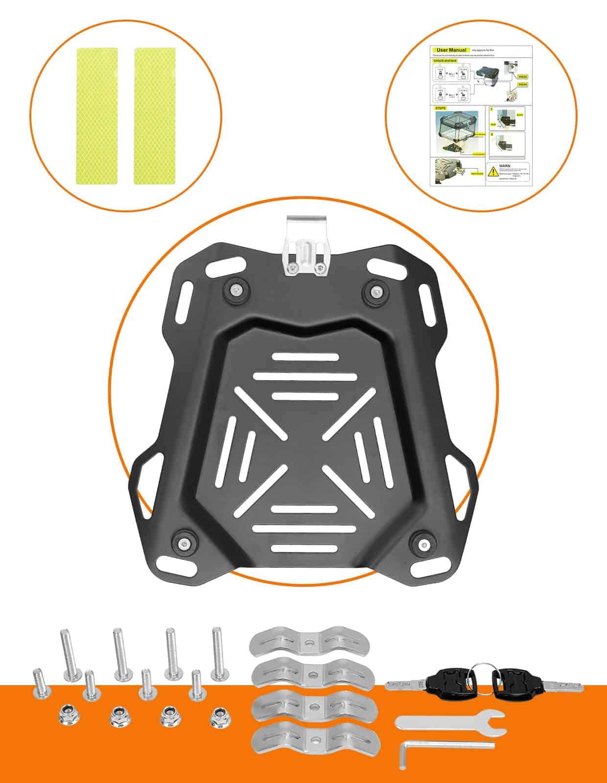 Cada parte de este baúl de motocicleta ha sido cuidadosamente diseñada y fabricada con materiales de alta calidad. La placa de montaje, los tornillos y la almohadilla de sujeción en el paquete están fabricados con acero inoxidable resistente para garantizar la durabilidad y seguridad del baúl durante el uso.