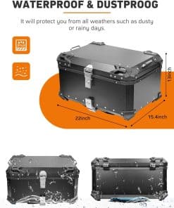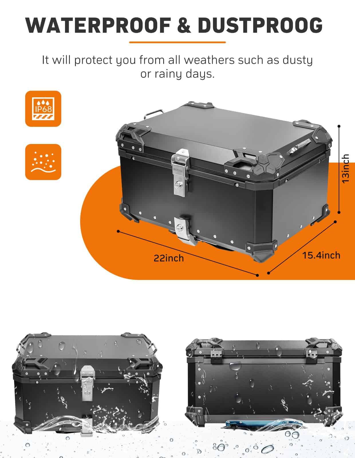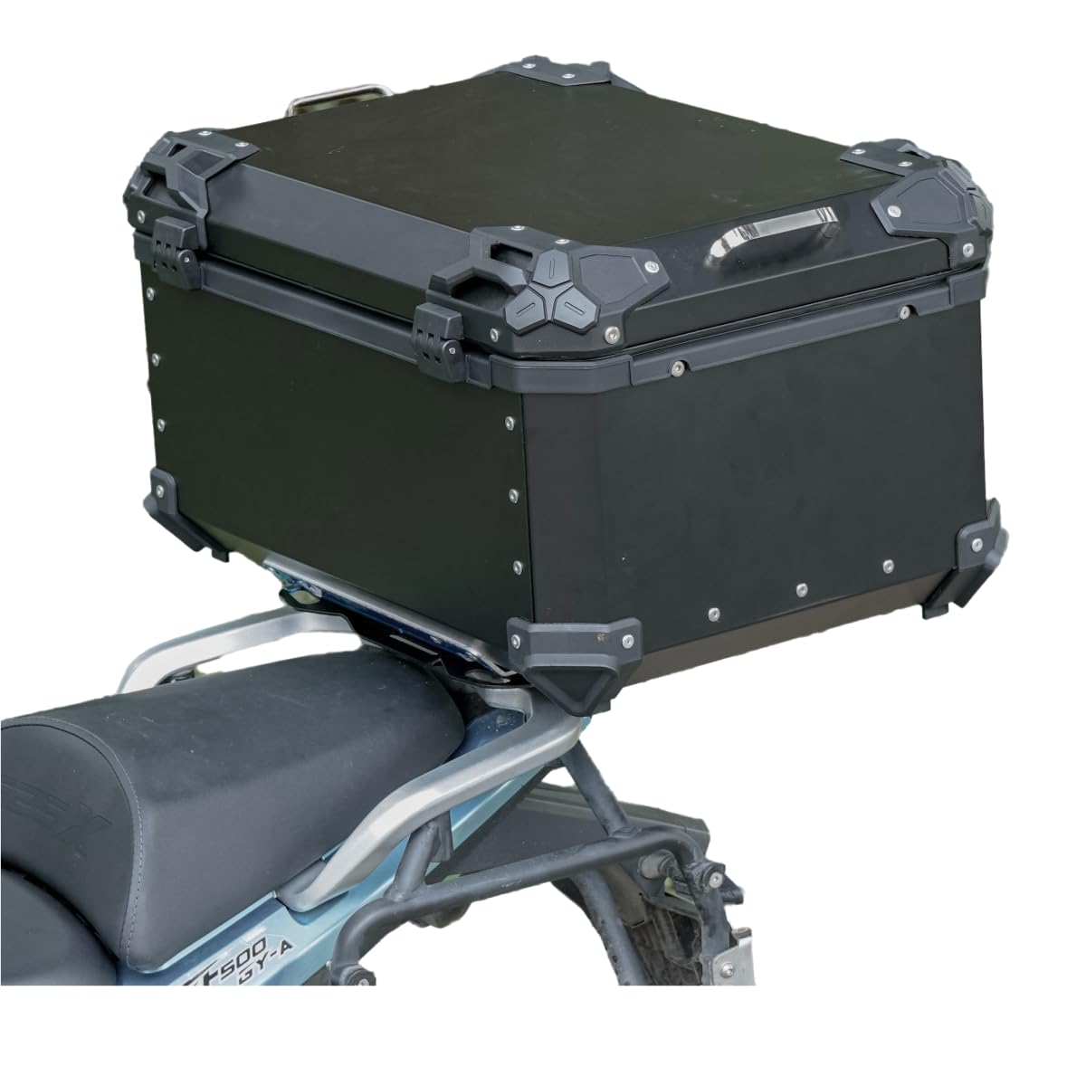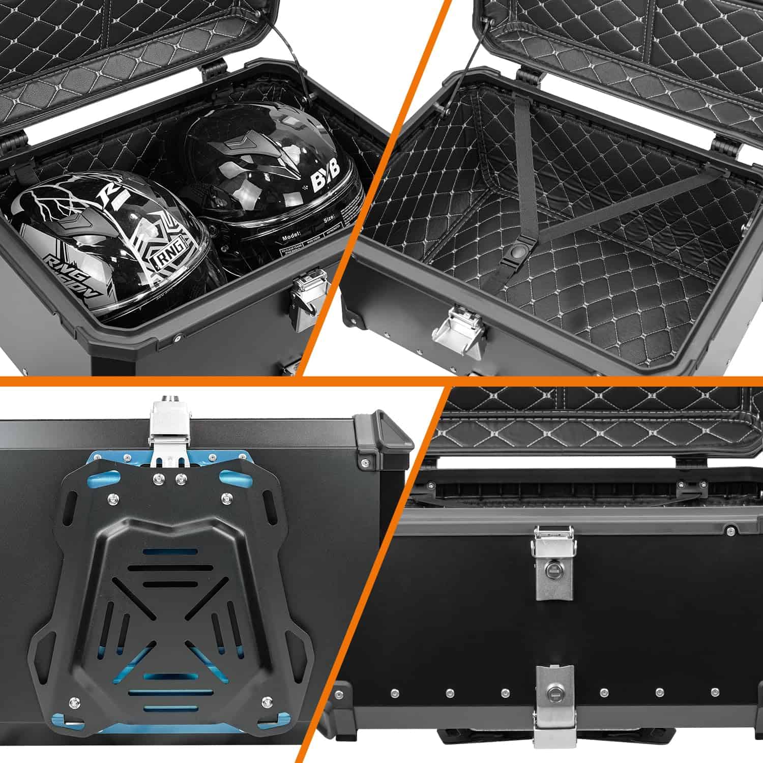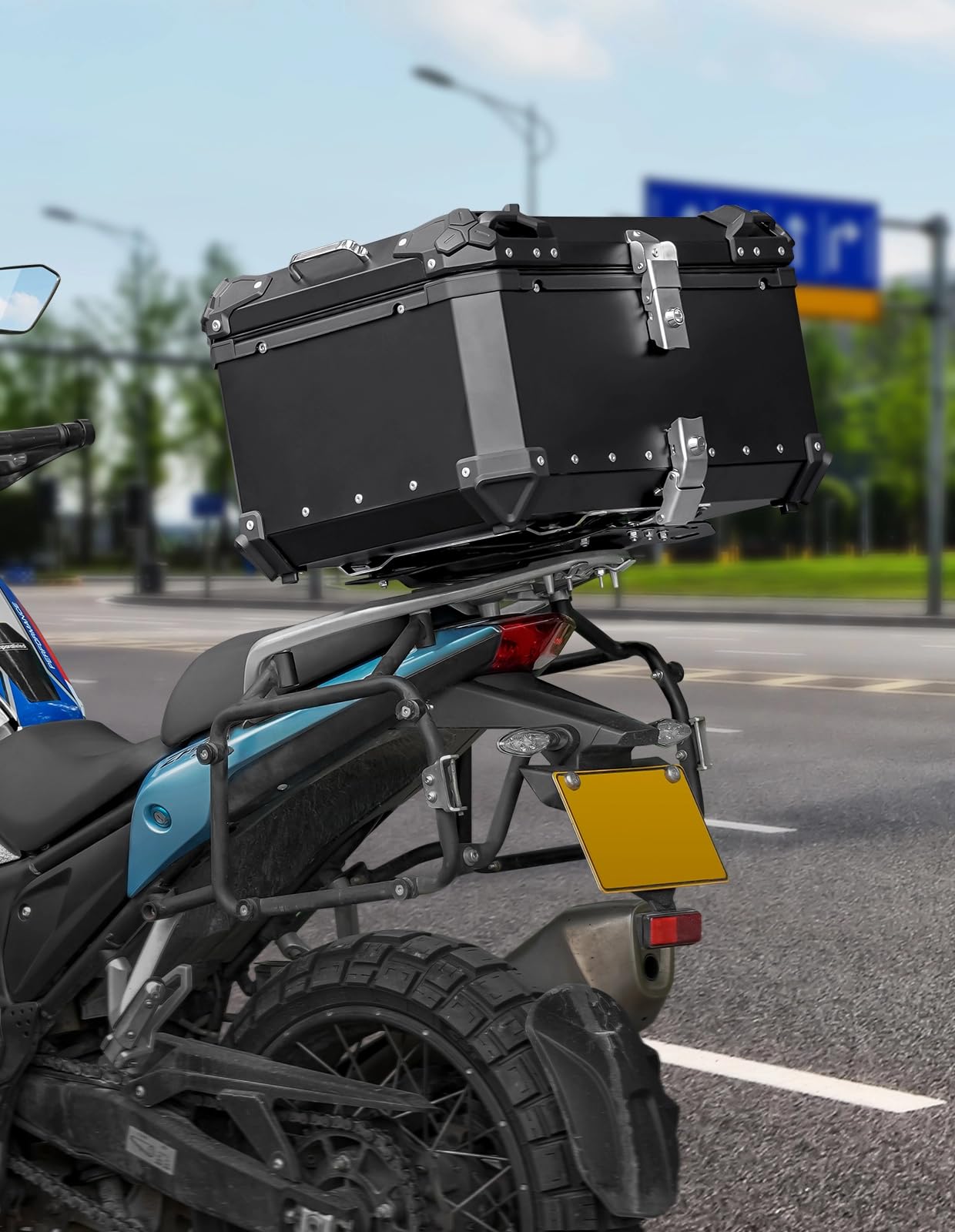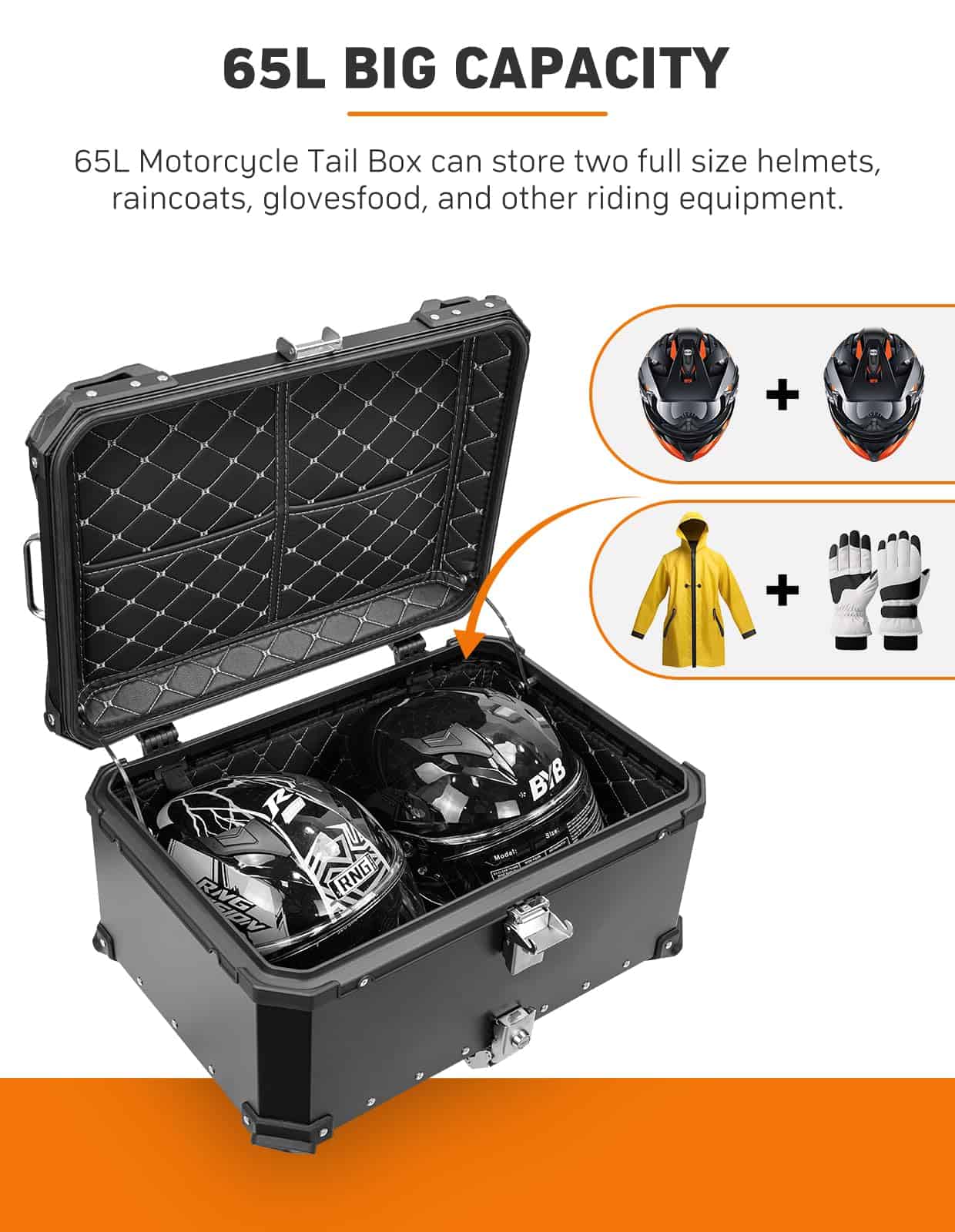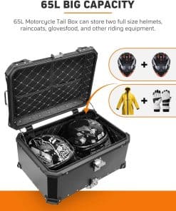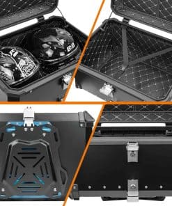 Hecho de aluminio de grado aeronáutico, este baúl de motocicleta proporciona una capacidad de almacenamiento de 65L para todos sus elementos esenciales de viaje. Con espacio suficiente para un casco integral y un casco abierto, así como para chaquetas, botellas de agua, toallas, y más, este versátil organizador de baúl de motocicleta se puede montar o desmontar fácilmente en el portaequipajes de su motocicleta para brindarle espacio adicional durante sus viajes.