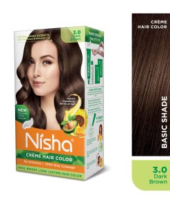 El Tinte para Cabello Nisha Crme es un tinte para cabello a base de crema con los beneficios de los extractos de Girasol, Aguacate y Henna, estas hierbas constituyen una mezcla perfecta para el tinte para cabello. El tinte para cabello Nisha crme no solo cubre tu cabello gris, sino que también hace que tu cabello sea suave, sedoso y elegante. Este color rico, brillante y de larga duración está disponible en 18 tonos hermosos. Todos los tonos son libres de amoníaco, excepto los tonos de Moda/Rubio