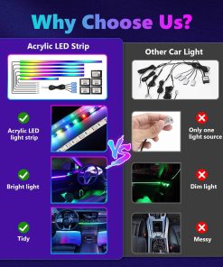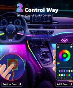 1. 2 en 1 Fuente de Iluminación: Las luces interiores LED para automóviles AMKI constan de dos partes: tira de luz LED + fibra óptica acrílica, plug and play, y esta luz acrílica se dispersa uniformemente sobre la tira de la lámpara, la iluminación es más estable y suave que la mayoría de las luces interiores de automóviles LED de una sola fuente en el mercado, el sensor sensible al sonido incorporado puede cambiar de color siguiendo el ritmo de la música, haz que tu automóvil se destaque con un estilo único y una libertad creativa.