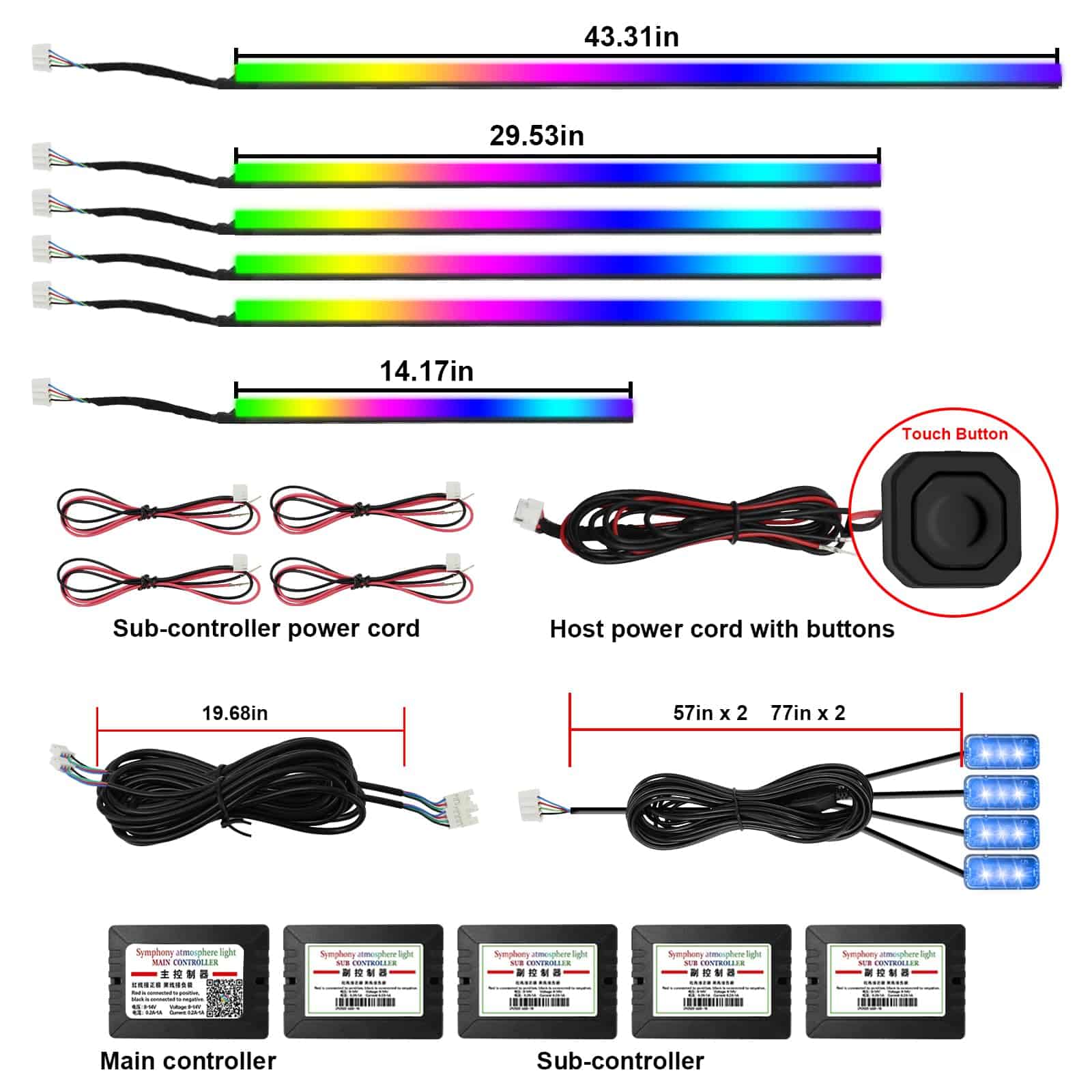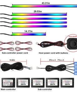 2. Diseño de Luz Ambiental para Automóviles: Las luces LED para automóviles AMKI incluyen 6 tiras de luz de fibra óptica acrílica (4 de 29,5 pulgadas + 1 de 43,3 pulgadas + 1 de 14 pulgadas), y 4 luces de espacio para los pies del interior del automóvil (51 pulgadas 2/66 pulgadas 2), un controlador principal y 4 subcontroladores, todas las herramientas de instalación necesarias están incluidas, fácil de instalar. Simplemente coloca la tira de luz de fibra óptica en el espacio del automóvil, oculta la línea de la luz para los pies del automóvil debajo de la alfombra del automóvil, sin tener que preocuparte por el cableado expuesto o un aspecto desordenado.
