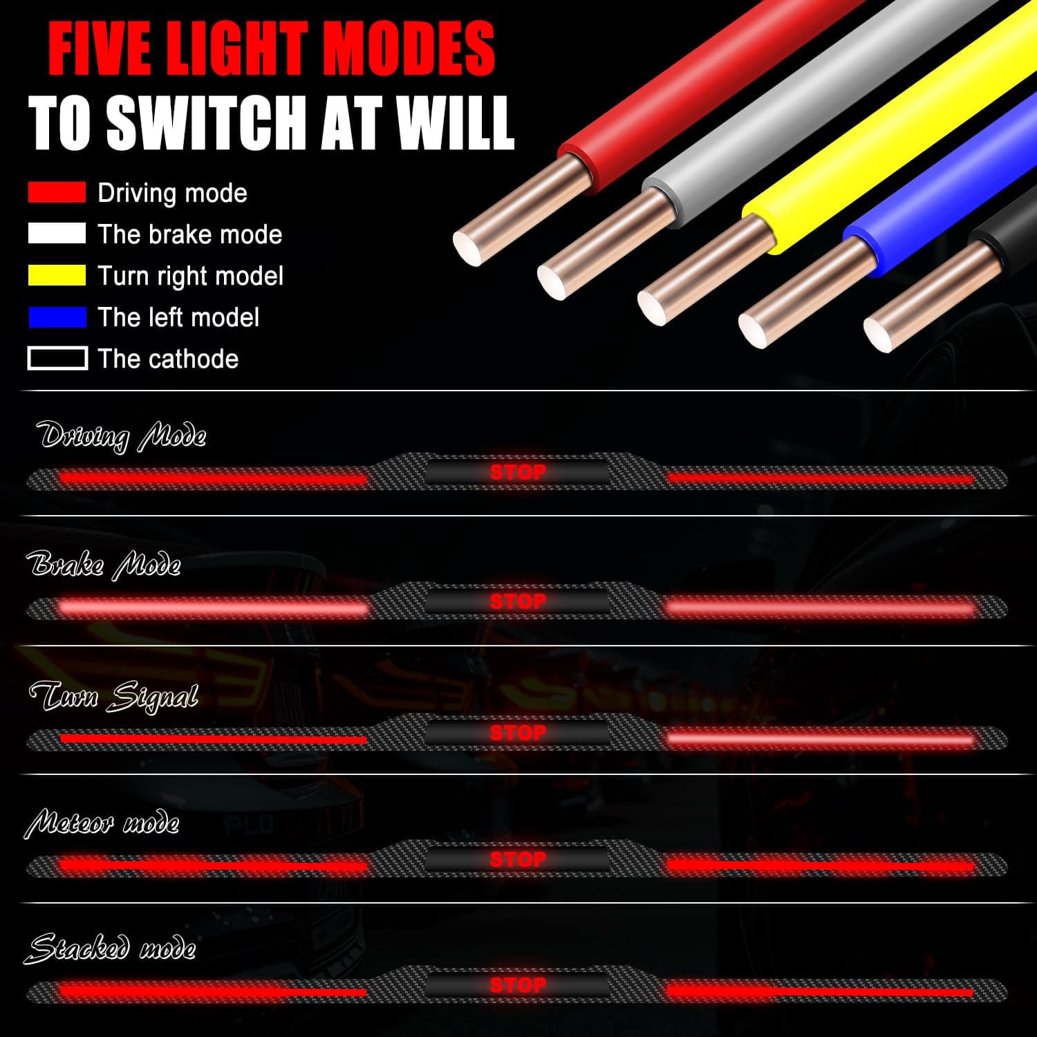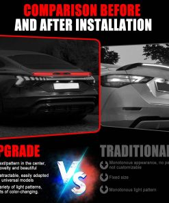 3. 4 Modos de Luz La tira de luz de spoiler led para automóvil tiene 4 funciones de luz: resaltado, convención, meteorito, apilamiento. Proporcionar una excelente función de iluminación e indicar la dirección izquierda y derecha para hacer que la conducción sea más segura, mientras tanto, los modos de luz están disponibles para cambiar para que su automóvil sea más fresco y moderno.