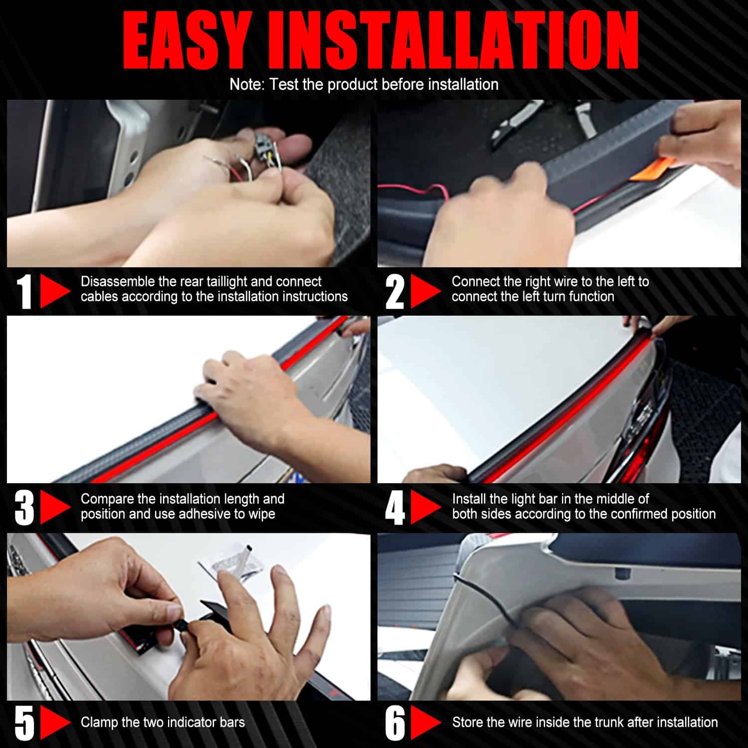 5. Fácil Instalación El kit de luz de spoiler LED viene con manual de instalación, simple y fácil de instalar. El diseño de adhesivo de alta calidad hace que se adhiera al automóvil firmemente y no sea fácil de desprender. Como un spoiler universal con luz de freno, se adapta al 99% de los automóviles en el mercado.