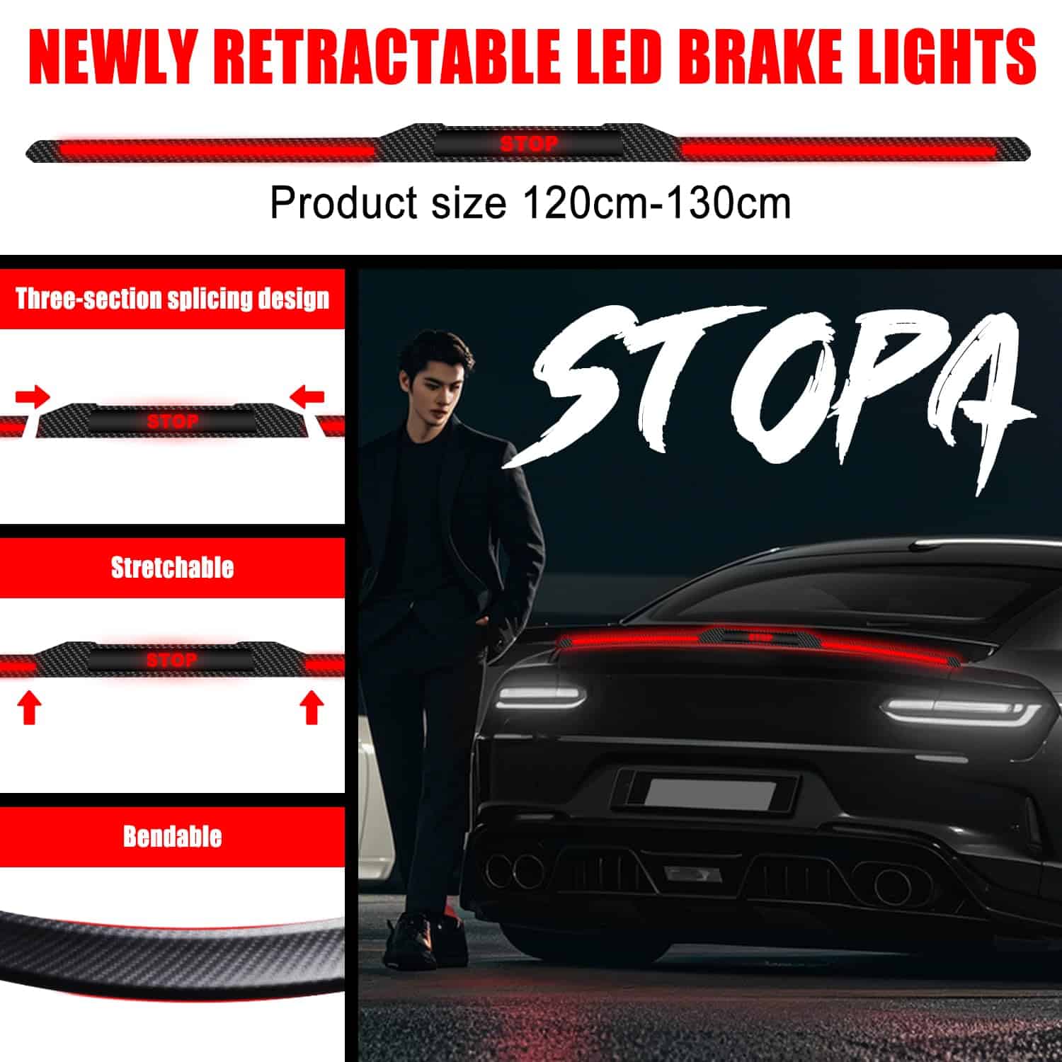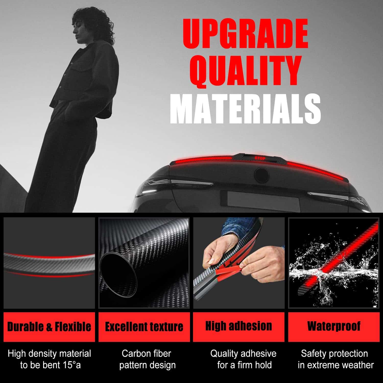 4. Material Duradero e Impermeable El diseño de material de la luz LED del spoiler de la parte trasera está hecho de goma duradera y resistente, que se puede montar en la tapa del maletero de su automóvil. La goma se puede doblar hasta 15 grados según sus necesidades de instalación. La alta densidad en la característica impermeable de goma gruesa hace que el Kit de Spoiler LED sea resistente a cualquier clima extremo como lluvia o nieve.