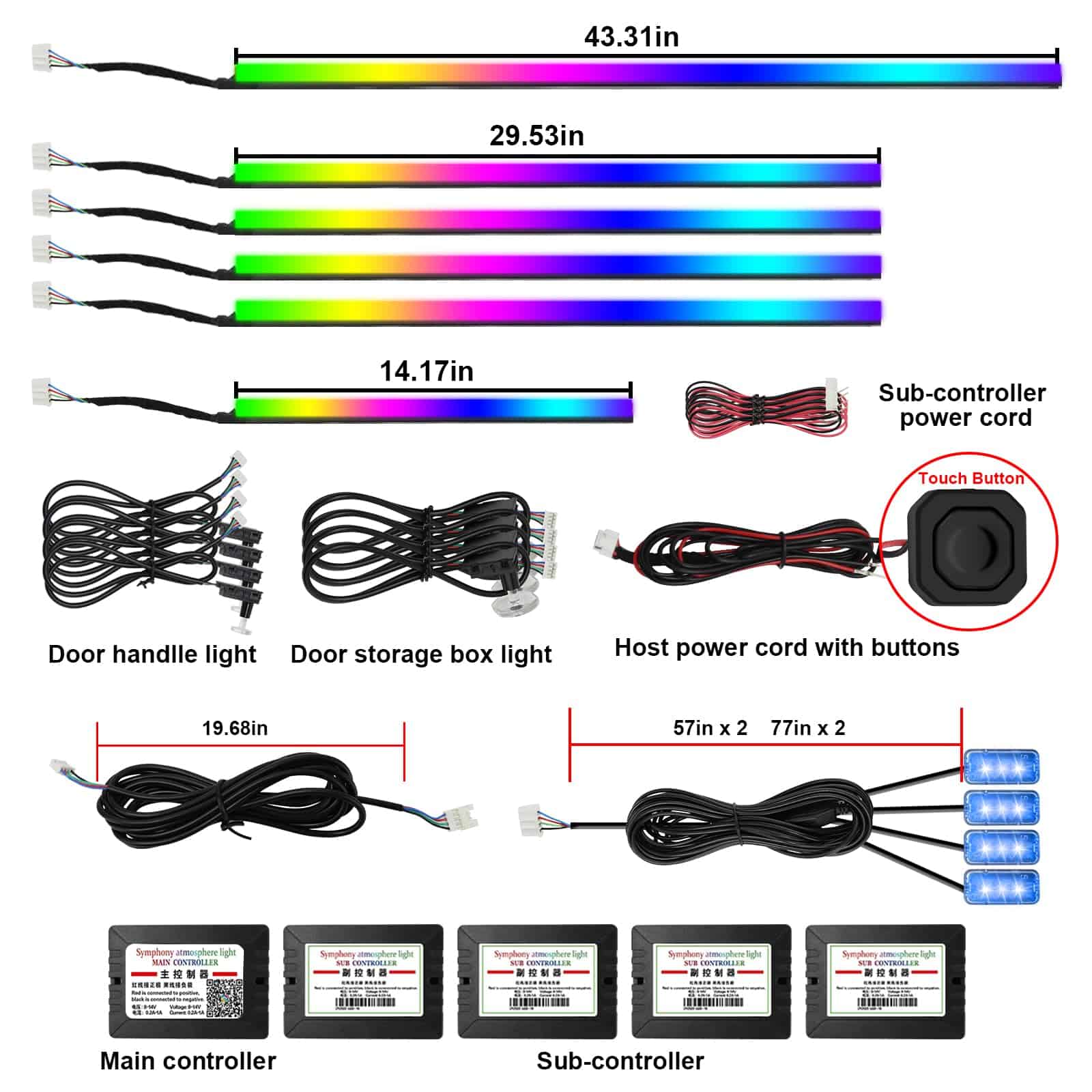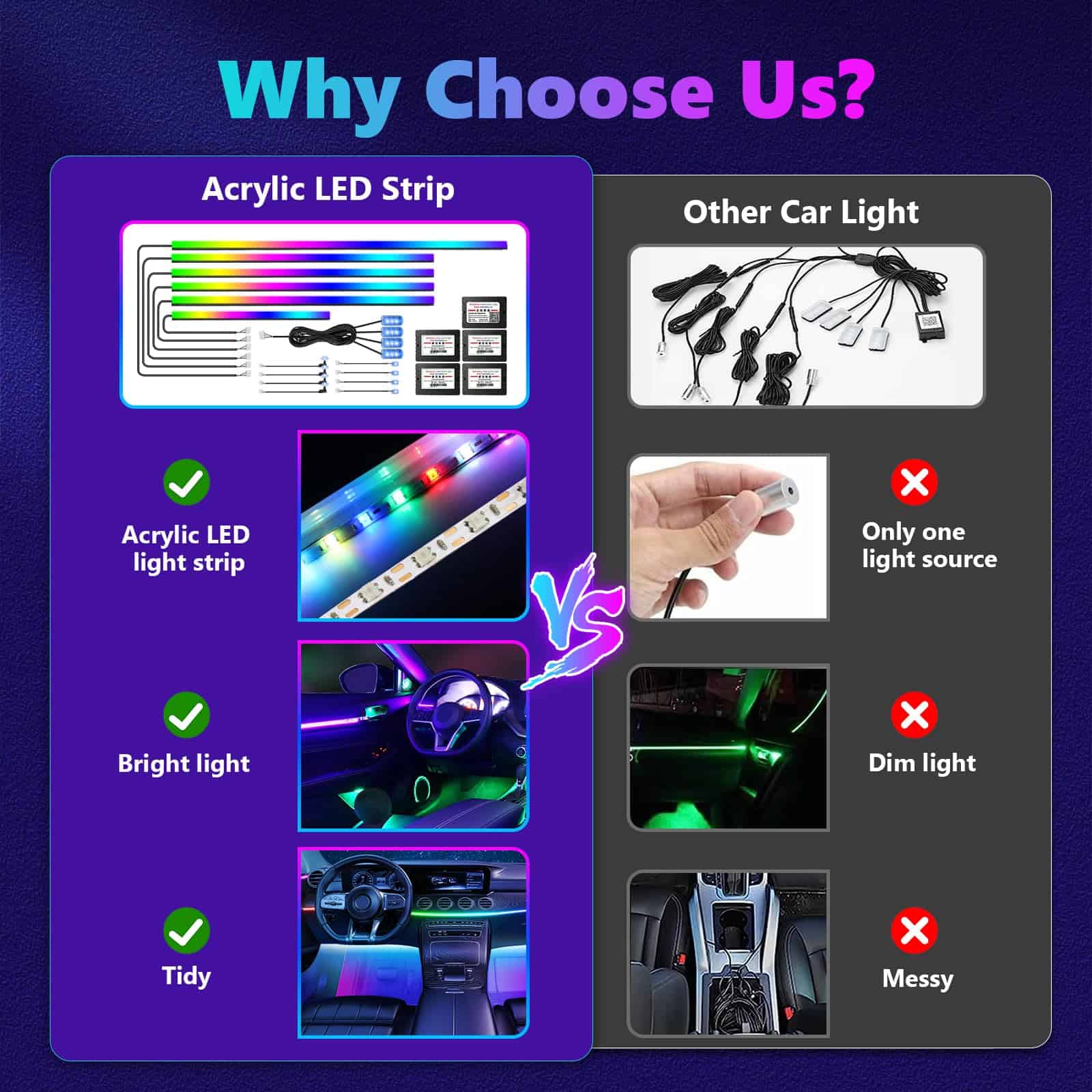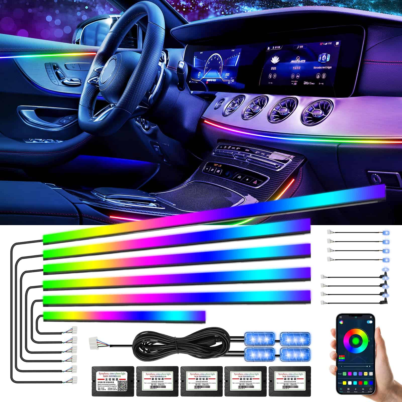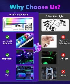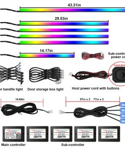 1. 2 fuentes de iluminación en 1: Las luces interiores de automóviles LED de AMKI constan de dos partes: tira de luz LED + fibra óptica acrílica, enchufar y listo, y esta luz acrílica se distribuye uniformemente sobre la tira de lámpara, la iluminación es más estable y más suave que la mayoría de las luces interiores de automóviles LED de fuente única en el mercado, el sensor sensible al sonido incorporado puede cambiar de color siguiendo el ritmo de la música, haz que tu automóvil se destaque con un estilo único con libertad creativa. 2. Diseño de Luz Ambiental para Automóviles: Las luces LED para automóviles AMKI incluyen 6 tiras de luz de fibra óptica acrílica (4 de 29.5 pulgadas + 1 de 43.3 pulgadas + 1 de 14 pulgadas), y 4 lámparas de interior para pies de automóviles (51 pulgadas 2/66 pulgadas 2), luz de mango de puerta 4, luz de caja de almacenamiento de puertas 4, un controlador principal y 4 controladores secundarios, todas las herramientas de instalación necesarias están incluidas, fáciles de instalar, sin tener que preocuparse por el cableado expuesto o un aspecto desordenado. 3. Se puede cortar a voluntad: Luces de automóvil acrílicas flexibles, se pueden doblar en cualquier forma y cortar a cualquier longitud que necesite, la parte cortada se puede desechar, la otra longitud no afecta el uso de la parte restante de las luces ambientales interiores. Puede satisfacer las necesidades de diferentes clientes en diferentes escenarios de uso. 4. 2 formas de control: Más de 16 millones de colores y 213 modos de color se pueden elegir a través de la aplicación Magic Lantern, adecuada para IOS o Andriod, y también puede ajustar el brillo y la velocidad del 0% al 100%, el modo de persecución de color RGBIC mejorado incorporado, brindándole una experiencia visual sorprendente. Botón táctil oculto: toque una vez para cambiar de color, manténgalo presionado durante 1-2 segundos para encender/apagar. Puede cambiar los colores y modos que desee a su gusto, sin más problemas para encontrar el control remoto en todas partes. 5. Garantía de seguridad y amplias aplicaciones: el voltaje de trabajo de esta luz ambiental para automóvil es de 12v, equipada con protección contra cortocircuitos y función de memoria. Impermeable, extremadamente bajo en calor, instalado en el espacio, seguro al tacto, seguro para los niños, Universal para todos los automóviles y camiones. Personaliza tus propios modos de colores únicos para mejorar perfectamente la actualización de tu automóvil. Da vida a tus viajes de fin de semana o viajes nocturnos con colores vibrantes.