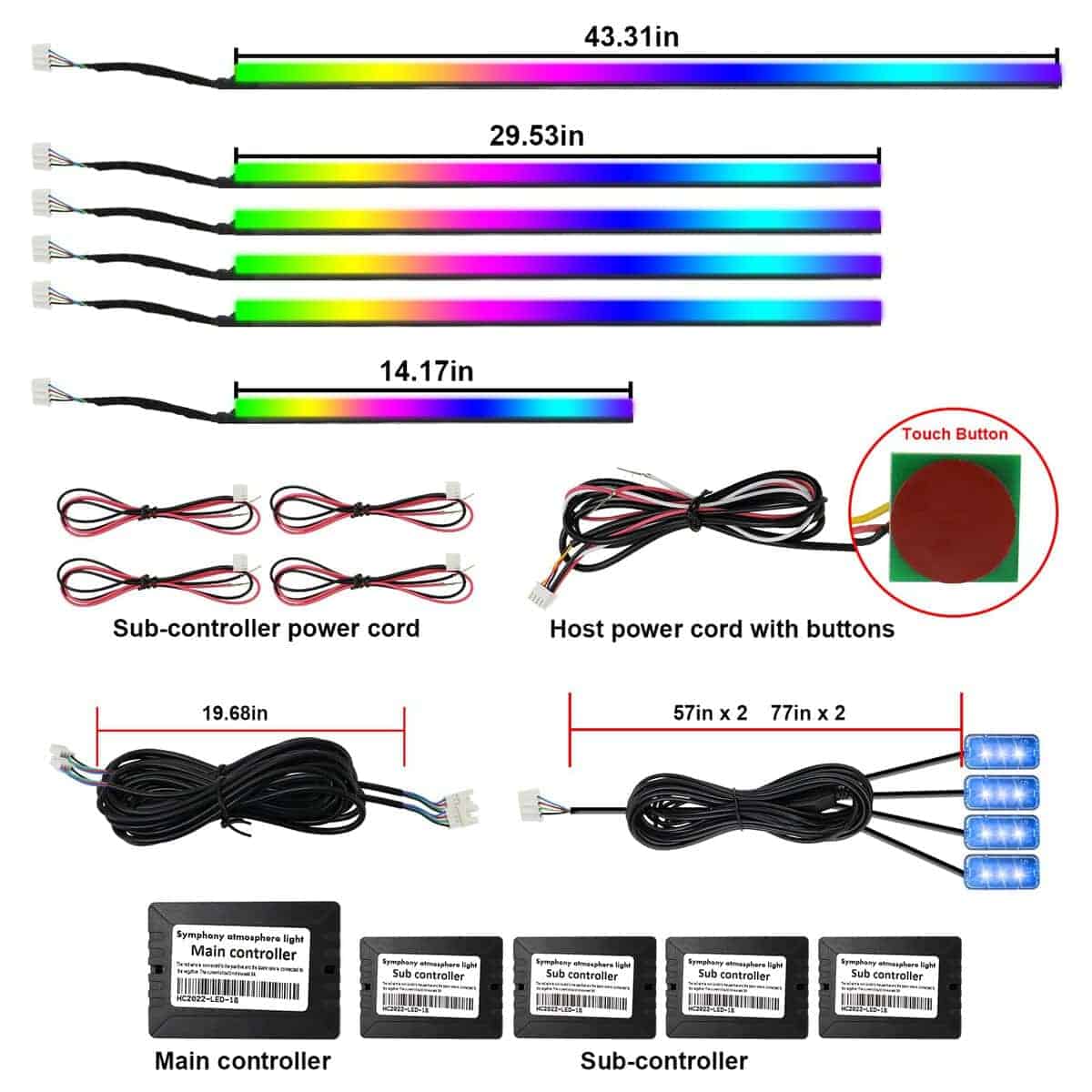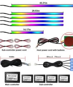 Diseño de luz ambiental para automóviles: Las luces LED para automóviles AMKI incluyen 6 tiras de luz de fibra óptica de acrílico (4 29.5 pulgadas + 1 43.3 pulgadas + 1 14 pulgadas), y 4 luces de bienvenida interiores para automóviles (51 pulgadas 2/66 pulgadas 2), un controlador principal y 4 sub controladores, todas las herramientas de instalación requeridas están incluidas, fáciles de instalar. Simplemente coloque la tira de luz de fibra óptica en la ranura del automóvil, oculte la línea de la luz del automóvil debajo de la alfombra del automóvil, sin preocuparse por el cable expuesto o un aspecto desordenado. Puede recortarse a voluntad: Luces de automóvil de acrílico flexibles, se pueden doblar en cualquier forma y cortar a cualquier longitud que necesite, la parte cortada se puede desechar, la otra longitud no afecta el uso de la parte restante de las luces ambientales interiores. Puede satisfacer las necesidades de diferentes clientes en diferentes escenarios de uso. 2 formas de controlar: Más de 16 millones de colores y 213 modos de color se pueden elegir a través de la aplicación Magic Lantern, adecuada para IOS o Andriod, y también puede ajustar el brillo y la velocidad del 0% al 100%, el modo de persecución de colores integrado RGBIC actualizado, brindándole una sorprendente experiencia visual. Botón táctil oculto: toque único para cambiar de color, toque prolongado durante 1-2 segundos para encender/apagar. Puede cambiar los colores y modos que desee a voluntad, no más problemas para encontrar el control remoto en todas partes. Garantía de seguridad y amplias aplicaciones: El voltaje de trabajo de esta luz ambiental para automóviles es de 12 V, equipado con protección contra cortocircuitos y función de memoria. Resistente al agua, extremadamente bajo calor, instalado en el espacio tocable, seguro para los niños, universal para todos los automóviles y camiones. Personalice sus propios modos de color únicos para una mejora perfecta al mejorar su automóvil. Anime sus viajes por carretera de fin de semana o desplazamientos nocturnos con colores vibrantes.