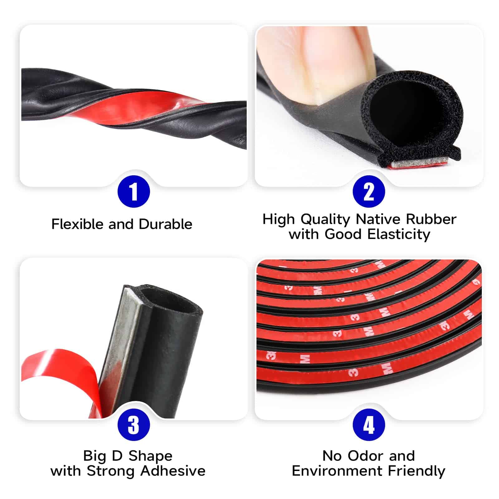 1. BUEN ASISTENTE PARA TU AUTO La tira de sellado de goma flexible en forma de D de EPDM con cinta adhesiva de respaldo ayuda a tu auto a llenar los huecos y grietas y alejar el polvo, el ruido y las filtraciones de agua, incluso en condiciones climáticas extremas o temperaturas. Después de usar este producto, tendrás una experiencia de conducción más tranquila y cómoda.