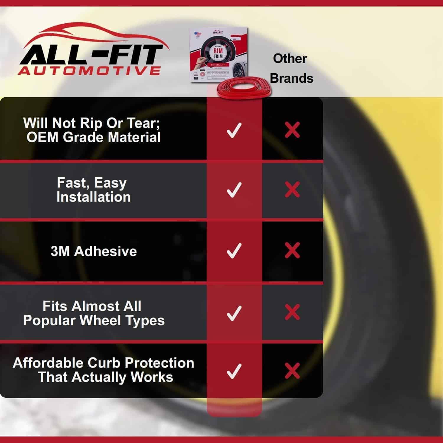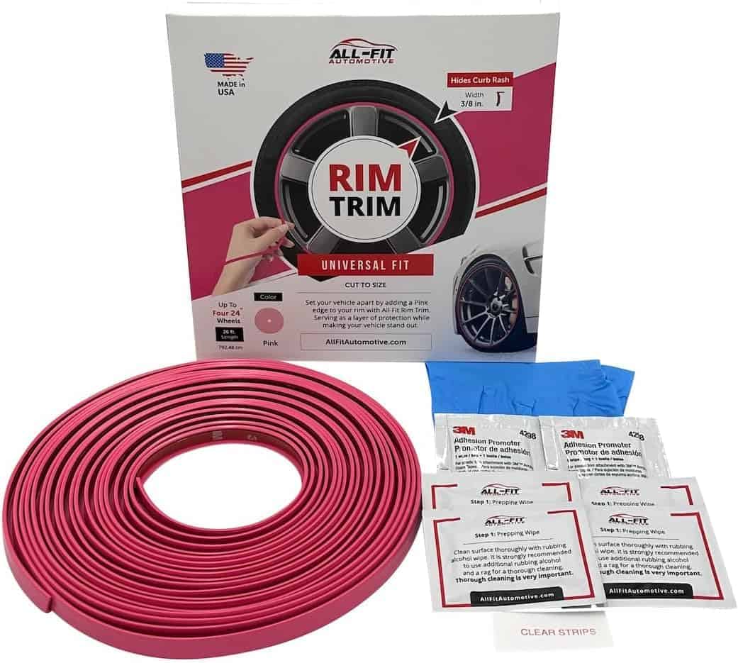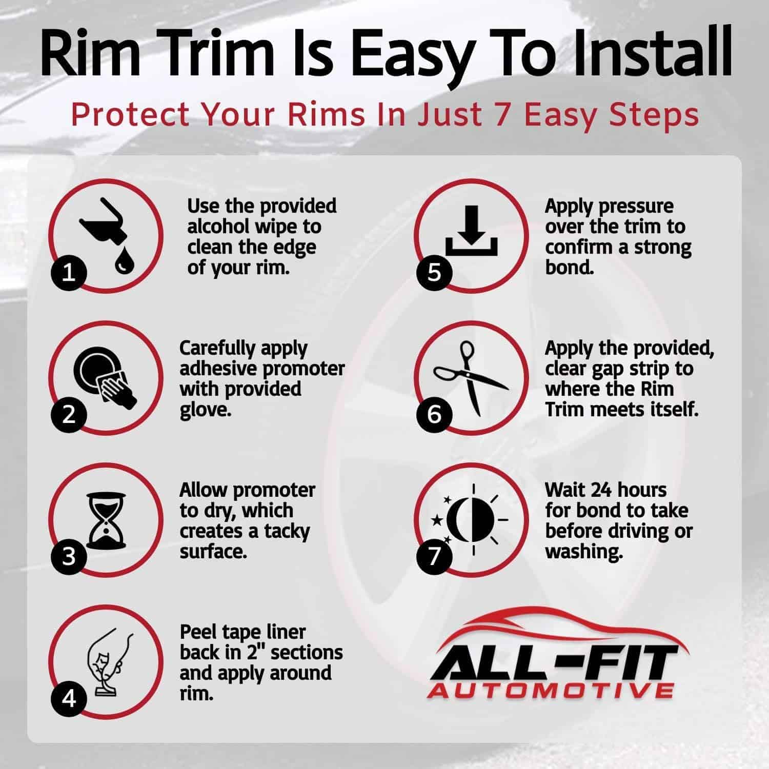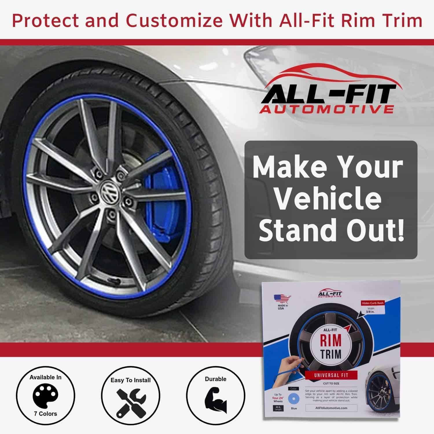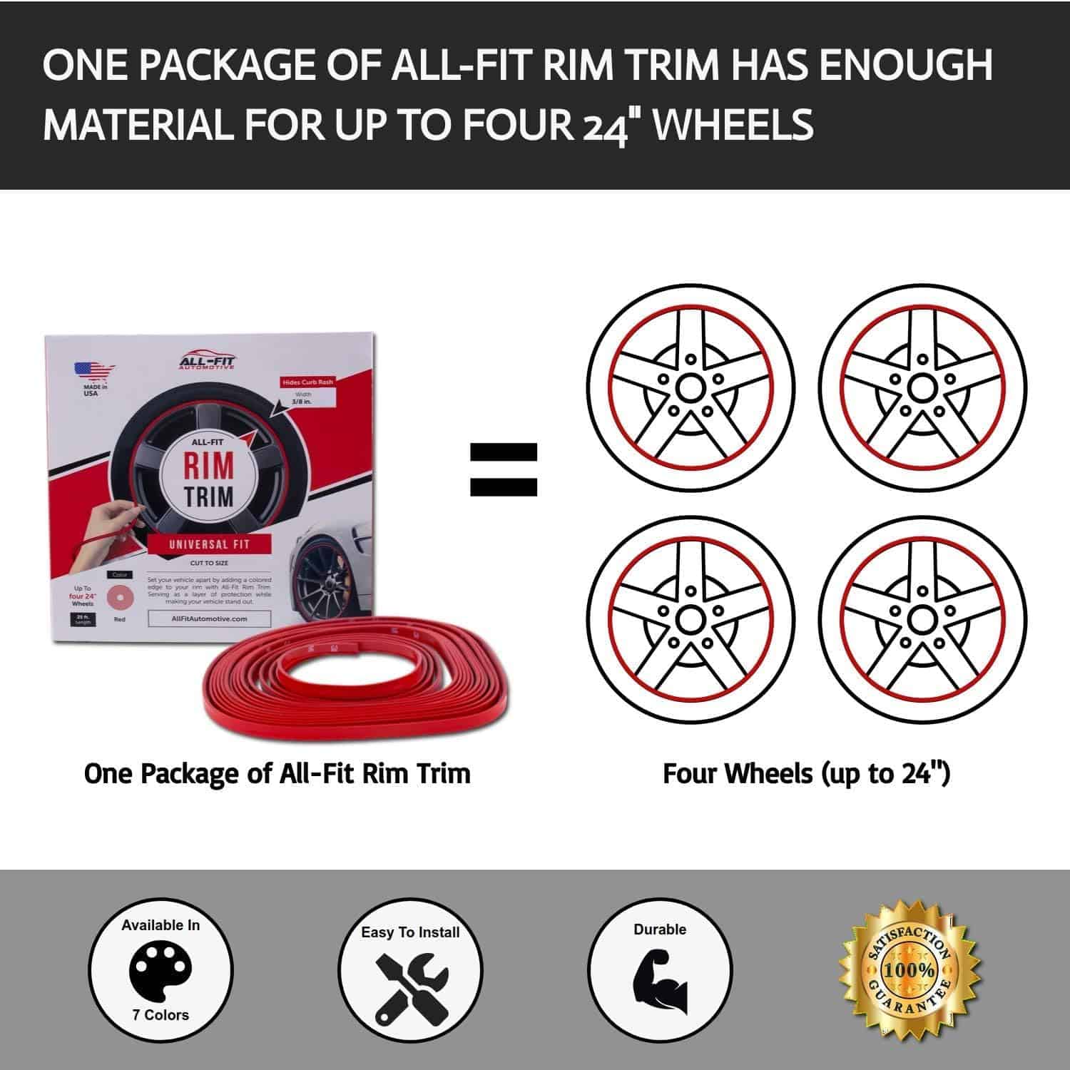 All-Fit Rim Trim hará que tu vehículo se destaque del resto, al mismo tiempo que protege tus llantas de daños por roce en bordillos, rasguños y otros daños. Ya sea que elijas un color de Rim Trim que complemente el color de la pintura de tu vehículo, o optes por un color negro o plateado que se mezcle, estamos seguros de que Rim Trim agregará estilo y protegerá tu vehículo. Rim Trim es un accesorio popular de protección de ruedas: desde el 350z hasta el Challenger o el WRX, los protectores de llantas son accesorios de automóvil especialmente populares entre los conductores de vehículos de alto rendimiento. Cada paquete de Rim Trim contiene todos los materiales que necesitas para instalar Rim Trim en cuatro llantas de hasta 24 pulgadas de tamaño, así como instrucciones detalladas. El proceso no es difícil y se puede hacer en tu propio garaje, pero debes tener cuidado de instalar el producto correctamente. Una instalación cuidadosa garantiza que el adhesivo se adhiera correctamente y que tu Rim Trim dure todo el tiempo que debería. Personaliza tus llantas sin gastar una fortuna. Elige All-Fit Rim Trim para lo mejor en accesorios exteriores para automóviles.