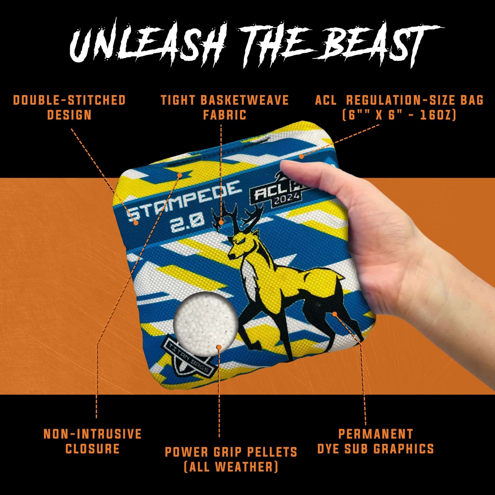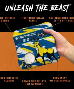 Eleva tu juego de corn hole con las bolsas de maíz Stampede 2.0 de Titan Bags. Diseñadas para uso profesional, estas bolsas de tiro de primera calidad son perfectas para torneos y juegos serios de tiro en interiores y exteriores. Confeccionadas con tela de cesta duradera y rellenas con pellets de agarre para cualquier clima, estas bolsas de maíz son esenciales para cualquier entusiasta serio.