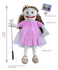 El títere de mano Rodayna mide aproximadamente 25 pulgadas de altura (de la cabeza a los pies). Jugar con nuestros títeres puede inspirar innumerables historias creativas y asombrosas aventuras imaginarias. La boca es fácil de mover. Simplemente inserta tu mano en la boca del títere y el títere puede actuar mientras hablas. La varilla de control del brazo del títere adjunta aportará movimiento a la mano y al brazo para hacer que tu títere cobre vida. Úsala para saludar, mandar besos, jugar al escondite, etc. Su alta calidad y atención al detalle los convierten en un regalo muy especial. Recomendado para mayores de 5 años.