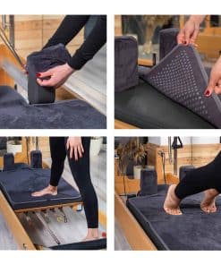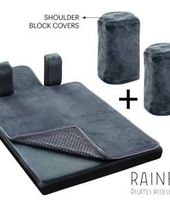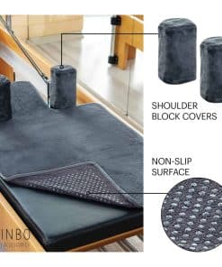 Las fundas de bloque para hombros están diseñadas como dos piezas separadas para adaptarse a la mayoría de las máquinas de pilates reformer. Este producto se vende en tres piezas como cobertura de toalla para el carruaje del reformer y dos fundas de bloque para hombros.