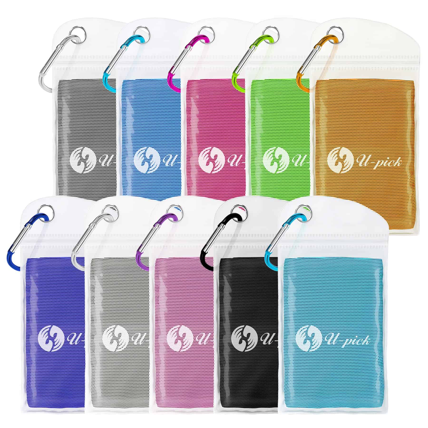 3. BOLSA IMPERMEABLE Y MOSQUETONES MULTIFUNCIONALES La bolsa impermeable U-pick facilita el almacenamiento de la toalla, puede colocar la toalla fría en la mochila o bolsa de gimnasio cuando esté húmeda. Los mosquetones se pueden sujetar fácilmente a bolsillos, clips de broche, portadores, cadenas y llevar llaves, botellas de agua, equipo de campamento, linternas, luces, etc.