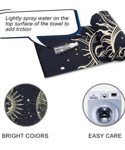 1. Microfibra Premium: Nuestra toalla de yoga está hecha con microfibra súper absorbente, suave y que absorbe la humedad como una esponja gigante. Ideal para sesiones sudorosas de Bikram, Yoga Caliente y Pilates, donde se necesita absorber el sudor para mantenerte en la postura y equilibrado. Para mejorar las cualidades antideslizantes de la tela, nuestra toalla de yoga viene con una botella atomizadora. Rocía ligeramente agua en la toalla de yoga antes de tu práctica de yoga. Cuanto más húmeda esté, mejor agarra.