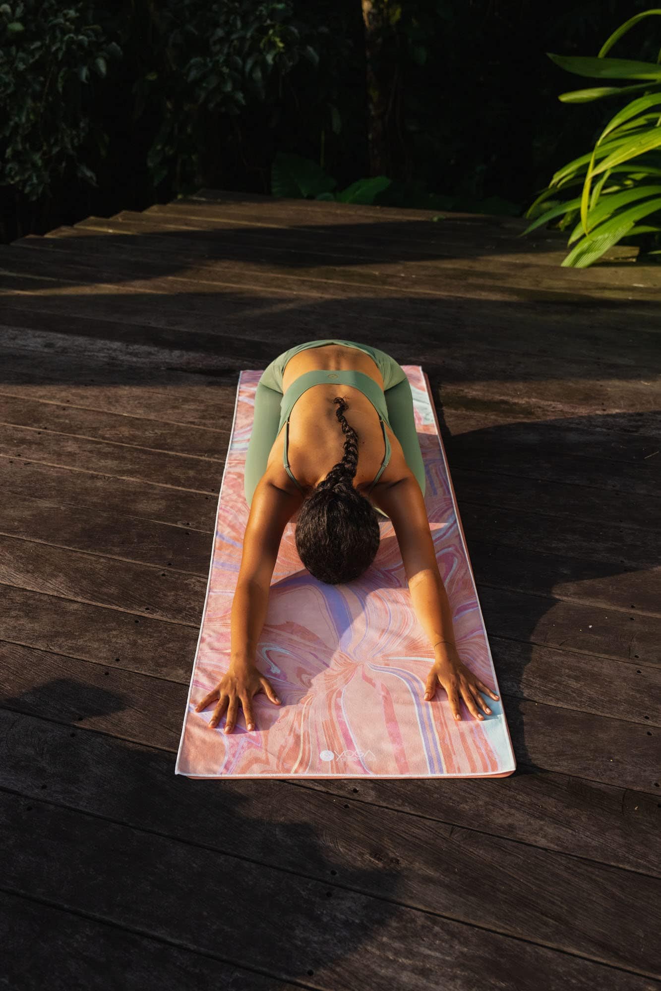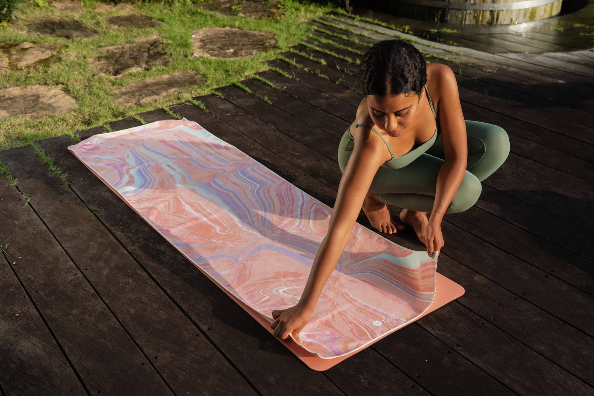 Consejo: Al principio de tu práctica, rociar ligeramente agua en la superficie superior de la toalla evitará el deslizamiento, si tienes las manos y los pies secos