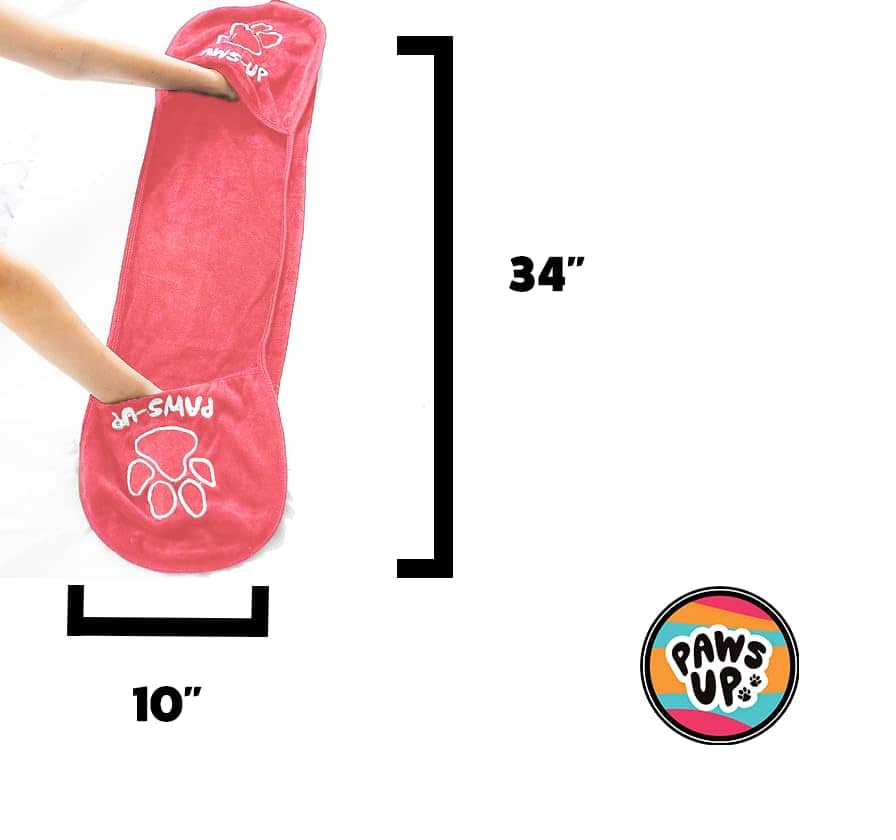 La toalla Paws Up XL está equipada con dos bolsillos que se deslizan fácilmente sobre tus manos, dándote más control si tu perro es grande. ¡Quita rápidamente y fácilmente barro, escombros, arena y humedad de tu mascota en movimiento o en casa! Patas embarradas, sucias, arenosas, húmedas; ¡no son rival para la toalla Paws Up! Nuestras toallas de microfibra son de secado rápido y súper suaves, por lo que no dañarán la piel, pelaje o patas de tu cachorro. Además del material suave y absorbente, la toalla de 34″ x 10″ puede envolver a tu mascota mientras la estás limpiando, actuando como una forma de calmarla. Por encima de todo, nuestras toallas Paws Up te dan más control y acelerarán el tiempo que toma limpiar las patas de tu perro sobre una toalla voluminosa. Con las toallas Paws Up, es fácil convertir una tarea en una recompensa. Las toallas Paws Up también son perfectas para llevar en tu bolso; para un paseo al parque para perros; para una carrera en la playa; en paseos diarios; y para subir al auto después de una aventura. Guarda una toalla Paws Up en tu auto para estar listo para cualquier cosa. ¡Estamos aquí para ayudarte a enfrentar los desordenes fangosos de todos los días en tu hogar y en movimiento! ¡Patas embarradas, no hay problema! La Toalla para limpieza de patas Paws Up XL Ultimate fue desarrollada para abordar la importancia de la salud y comodidad adecuadas de las patas de tu perro. La misión de nuestra empresa dice «Estamos dedicados al cuidado y mantenimiento adecuado de las patas de las mascotas en relación con la salud general y la comodidad de las mascotas».