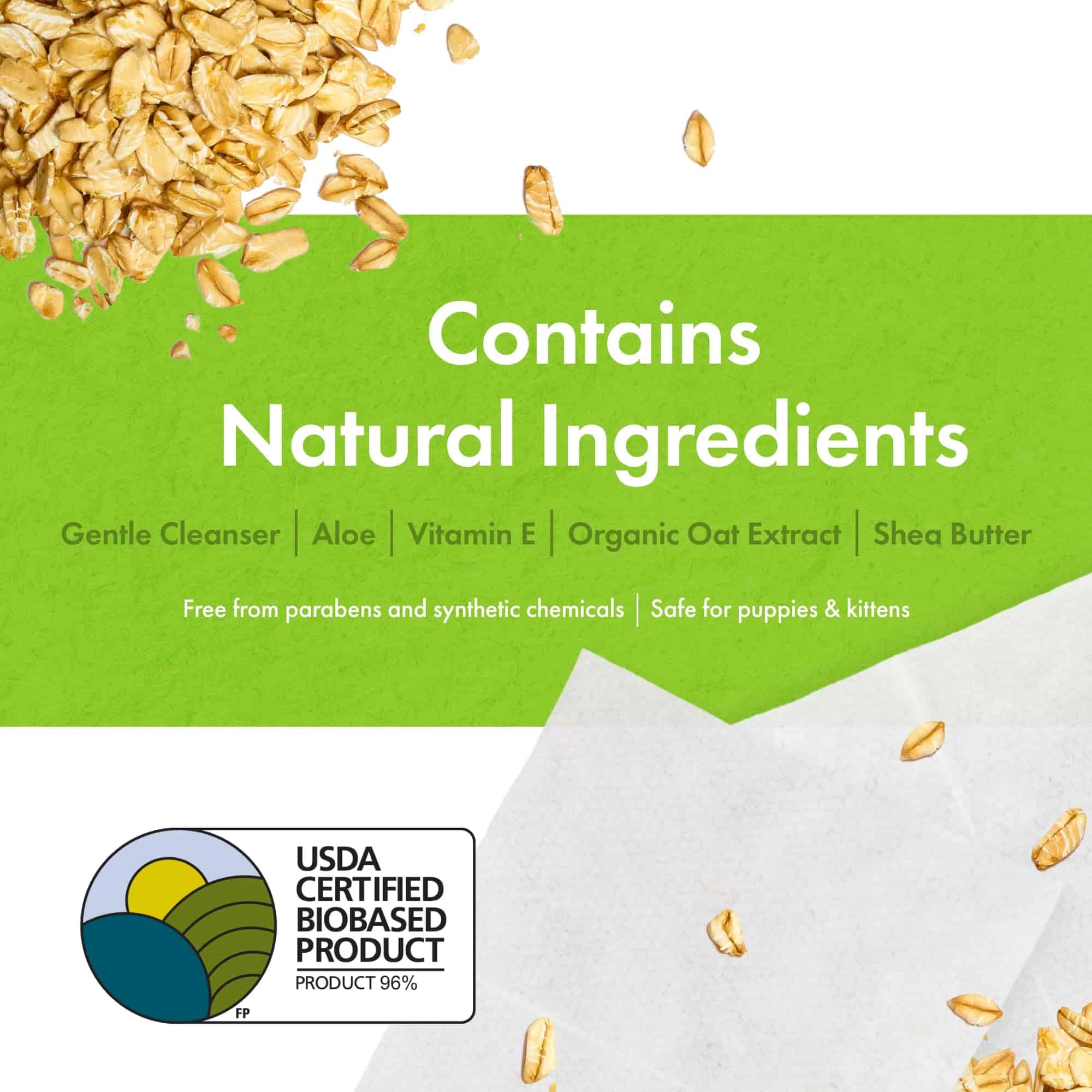 Toallitas extrasuaves para tu amigo peludo. Cada toallita está humedecida con una fórmula suave de limpieza para limpiar y acondicionar a tu mascota. Son lo suficientemente suaves para usar a diario alrededor de los ojos, oídos, cara, cuerpo y cola. Seguras para cachorros y gatitos. Sin fragancia. Limpia conscientemente. Estas duraderas y sostenibles toallitas a base de plantas tienen un tamaño de 6.7 x 4.7 pulgadas, lo que te permite limpiar y desodorizar rápidamente a tu mascota entera. No es necesario agua ni enjuague, por lo que es fácil para ti y bueno para el planeta. Fáciles de usar. Simplemente abre la tapa y saca una toallita del centro del rollo y pásala por la abertura en la tapa. Limpia suavemente a tu mascota hasta que esté limpia. Usa más toallitas si es necesario. Cuando tu mascota esté seca, esponja el pelaje con la mano o un cepillo si lo deseas. Ingredientes naturales para una limpieza segura y suave. Contiene Limpiador Suave, Aloe, Vitamina E, Extracto de Avena Orgánica, Manteca de Karité. Sin Parabenos.