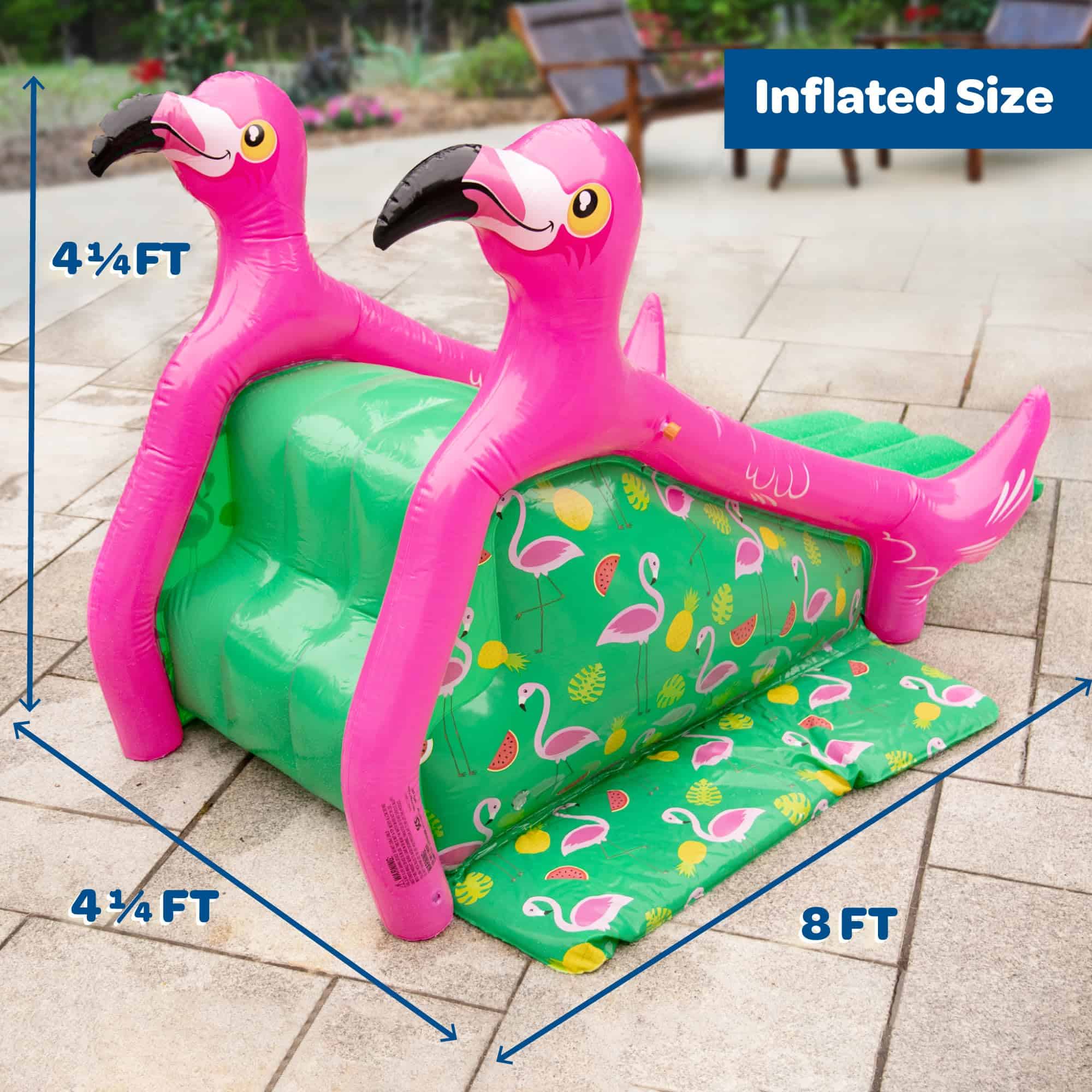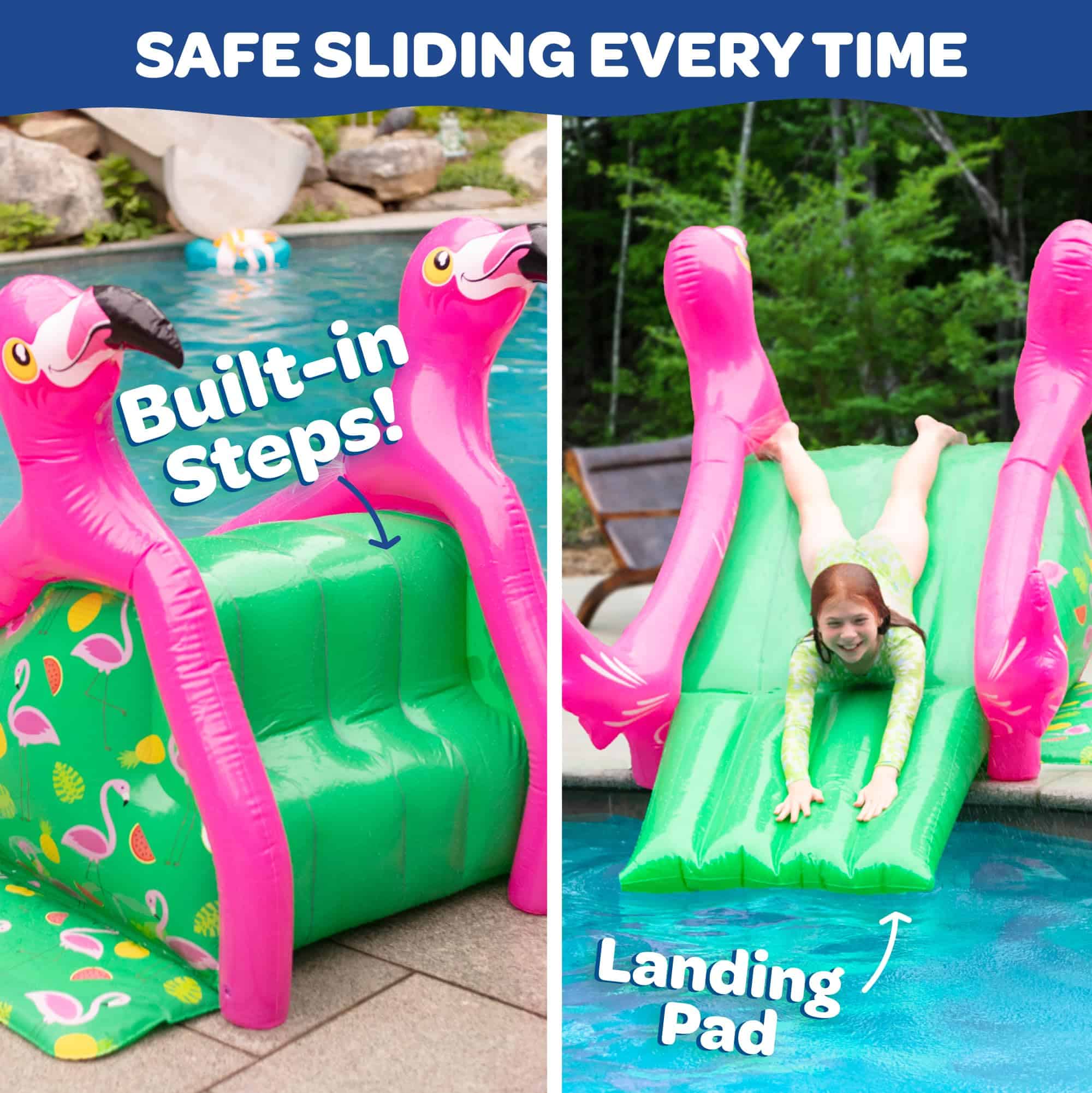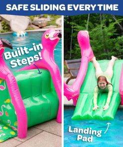 2. DISEÑO DE FLAMENCO: El divertido diseño de animal flamenco agrega magia y diversión a cualquier piscina trasera: Con un diseño de flamenco colorido y adorable, este tobogán de piscina seguramente deleitará a los niños que les encanta imaginar y explorar.