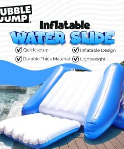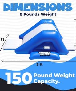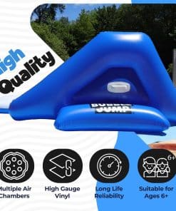 El tobogán para piscina en el patio trasero BubbleJump es adecuado para edades de 7 años en adelante y puede soportar hasta 150 libras. Pero no es solo un tobogán acuático para niños, también es un tobogán acuático inflable para adultos. ¡Así que todos pueden unirse a la diversión! Con esto en su patio trasero, no necesitará buscar otros toboganes hinchables para el patio trasero.