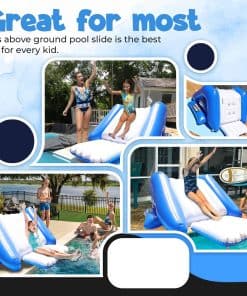 La seguridad es nuestra prioridad. Este tobogán para piscina enterrada, así como para piscinas sobre tierra, viene con una extensión de almohadilla de aterrizaje suave que se adentra en la piscina para una seguridad adicional. El tobogán acuático para niños y adultos también cuenta con escaleras inflables y una alfombra en la parte trasera para subir fácilmente, 2 asas resistentes y un rociador incorporado para ayudar a deslizarse suavemente hacia abajo.