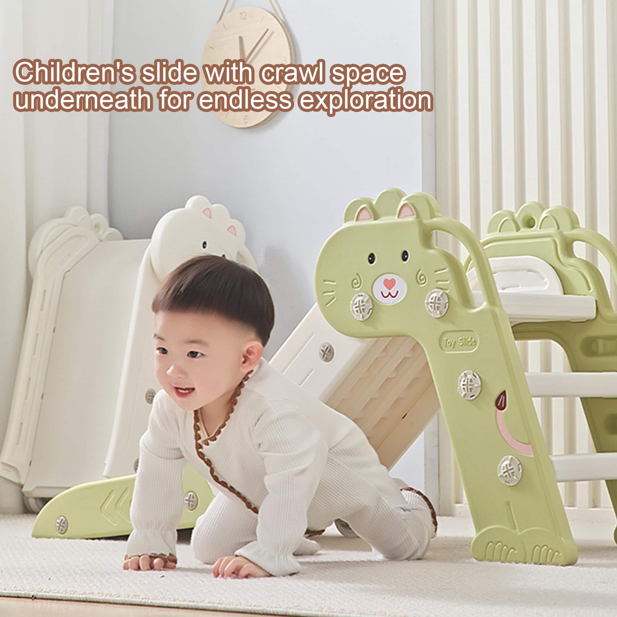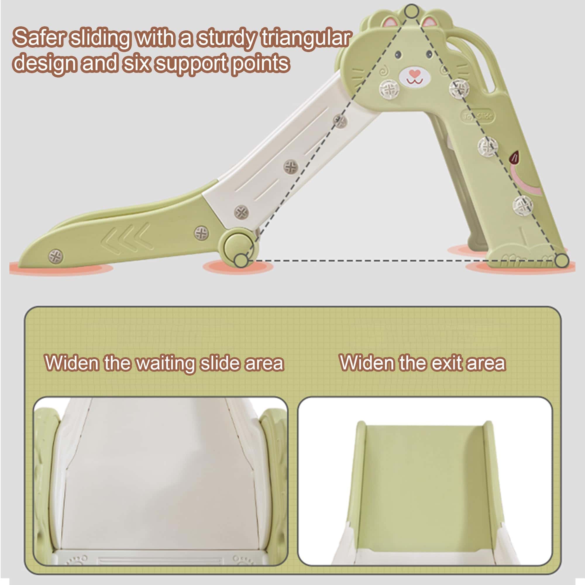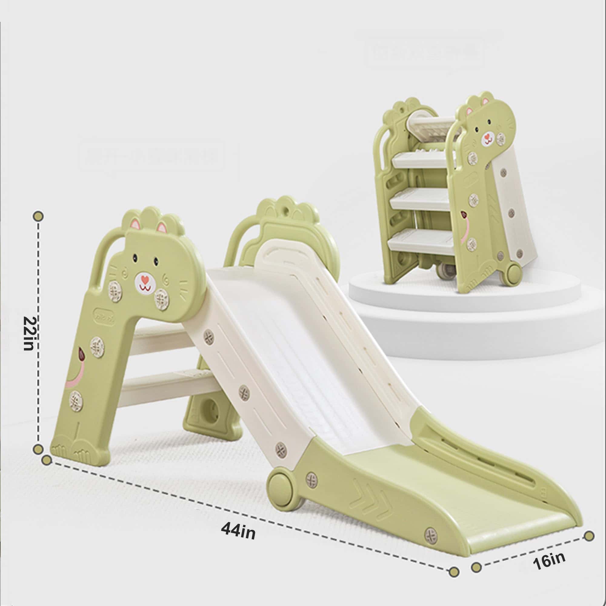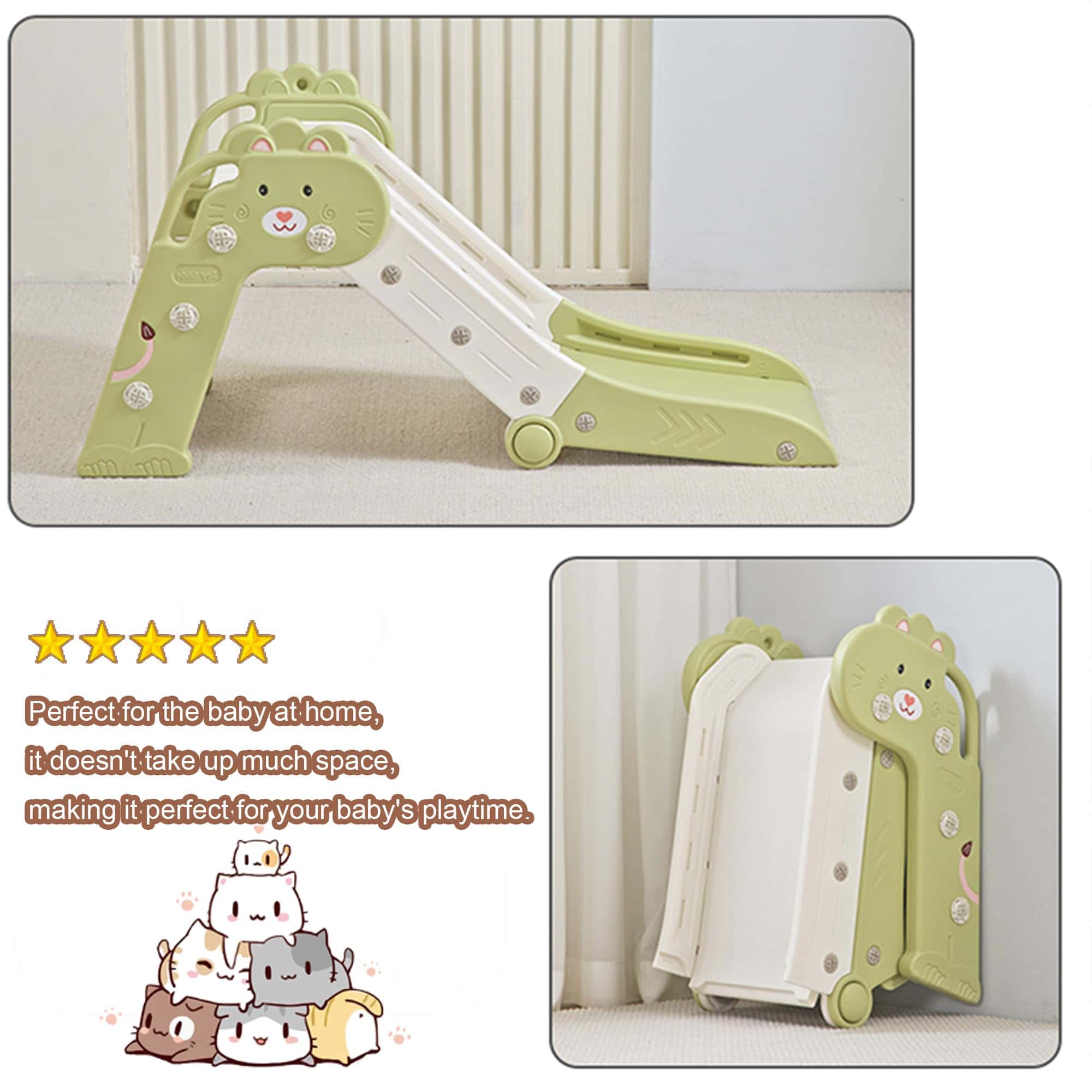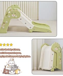 4. Plegable y Ahorro de Espacio: El tobogán plegable para niños fácil de ensamblar ocupa poco espacio cuando se guarda plegado. La característica de doble plegado es parte deliberadamente del diseño para liberar espacio en el piso cuando no está en uso. Nuestra estructura compacta y liviana del tobogán para niños lo hace portátil y flexible al almacenarlo.