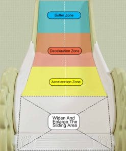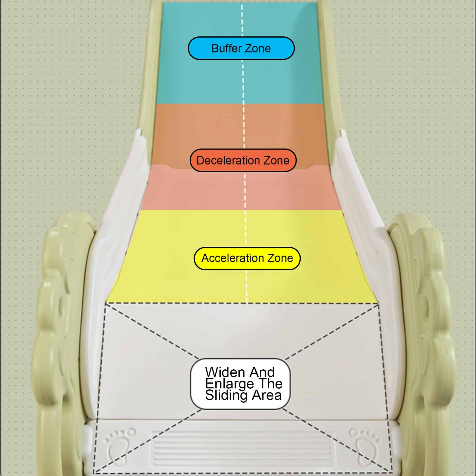 1. Pedales antideslizantes y Tobogán Suave: El tobogán suave se divide en una zona de aceleración y una zona de amortiguación comprometida a proporcionar más diversión y seguridad a los niños. El pedal ancho antideslizante no solo brinda suficiente espacio para que los niños escalen, sino que también puede evitar efectivamente que los niños se resbalen en la escalada.