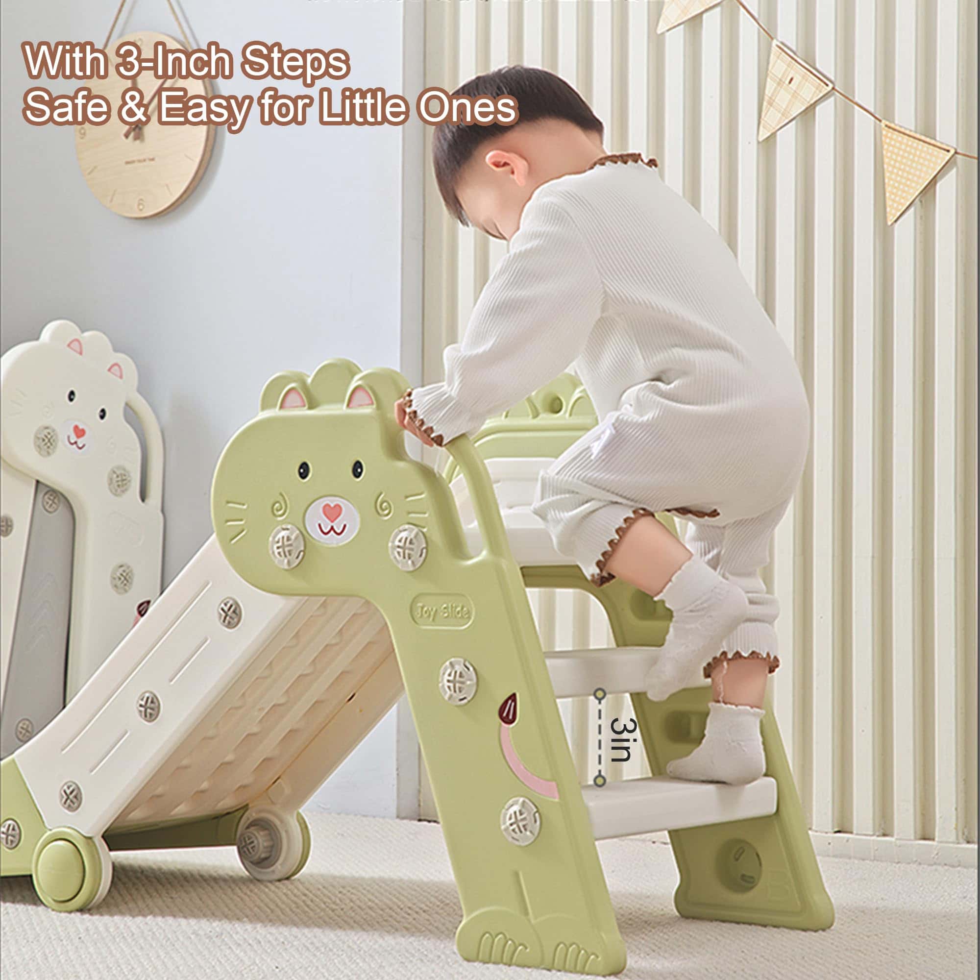 5. Fácil Montaje y Limpieza: El tobogán no requiere partes de instalación ni herramientas. Consta de solo dos pasos, dos paneles laterales y un tobogán. El montaje requiere menos de un minuto. La superficie suave es fácil de limpiar y mantener, garantizando seguridad e higiene para los niños.