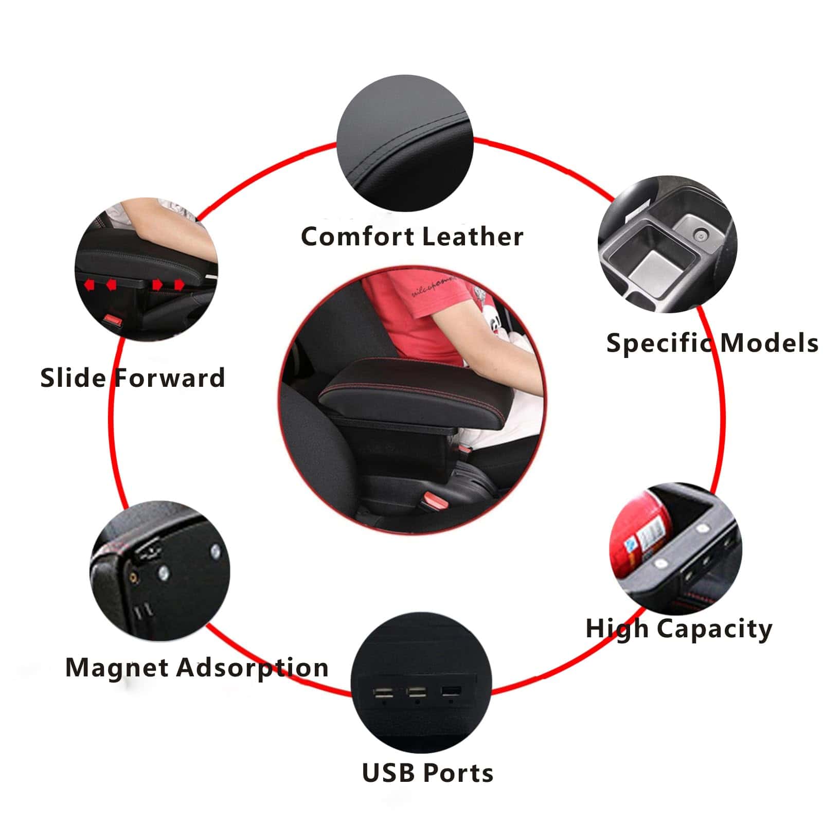 Fitment Armrest box fit for Honda Fit Jazz 2009-2013. Double layer Large Storage Space Double layer storage box can help you increase storage space. High Quality The armrest box is made of soft PU leather and durable ABS plastic, convient to place the elbow comfortably and rest your arm, alleviate the driving fatigue. Easy to Install Firmer and not loose. You only need to put the armrest box into the position behind the handbrake through pressure, without damaging the original car structure. Charging With 3 USB charging ports on the front and 4 USB ports on the rear for easy charging.