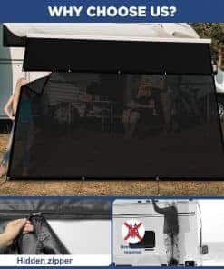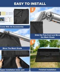 La instalación es sencilla gracias al diseño de cremallera. En tan solo 1-2 minutos, podrás colocar o quitar la pantalla superior con cremallera enrollándola en el eje del arco del RV. No se necesitan escaleras para la instalación.