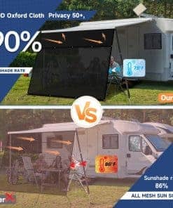 Protege tu espacio al aire libre con el toldo de sombra para RV Glamful con cremallera. Fabricado con tela Oxford 600D de alta resistencia y malla de vinilo de 8.11 oz, este toldo proporciona una protección solar superior con un 90% de protección UV. Además, mantiene la temperatura interna del RV baja al tiempo que garantiza un flujo de aire de 360 grados para mantenerte fresco y cómodo.