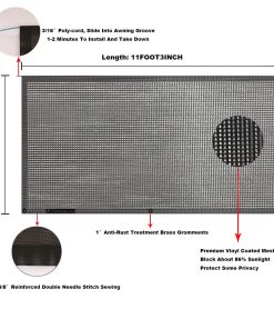 Toldo de malla Tentproinc RV Sun Shade Screen diseñado para accesorios de caravana para exteriores. Este toldo para caravana bloquea aproximadamente el 86% de los rayos UV, protegiendo su piel y sus ojos mientras disfruta de una amplia vista. Proporciona un lugar sombreado y acogedor para disfrutar cómodamente incluso en días extremadamente calurosos. Además, esta malla para toldo de caravana reduce eficientemente el viento, especialmente la fuerza del viento cruzado, lo que le proporciona un campo más acogedor cuando se utiliza con nuestro toldo lateral. La instalación y desmontaje son fáciles, ya que es ligero y cómodo al tacto. Viene con 3 juegos de estacas de plástico y bolas elásticas en una bolsa de almacenamiento para mayor comodidad. Medidas de sombra reales de 6 ‘de caída con 11’3 » de longitud, adecuado para toldo de 12 pies, y se adapta a la mayoría de las marcas de toldos como Dometic, Carefree, Lippert, Fiamma, Solera, etc. Por favor, tenga en cuenta que este toldo no es apto para Toldo Girard. Disfrute de la comodidad y protección que ofrece este toldo de malla para caravanas Tentproinc RV Sun Shade Screen.