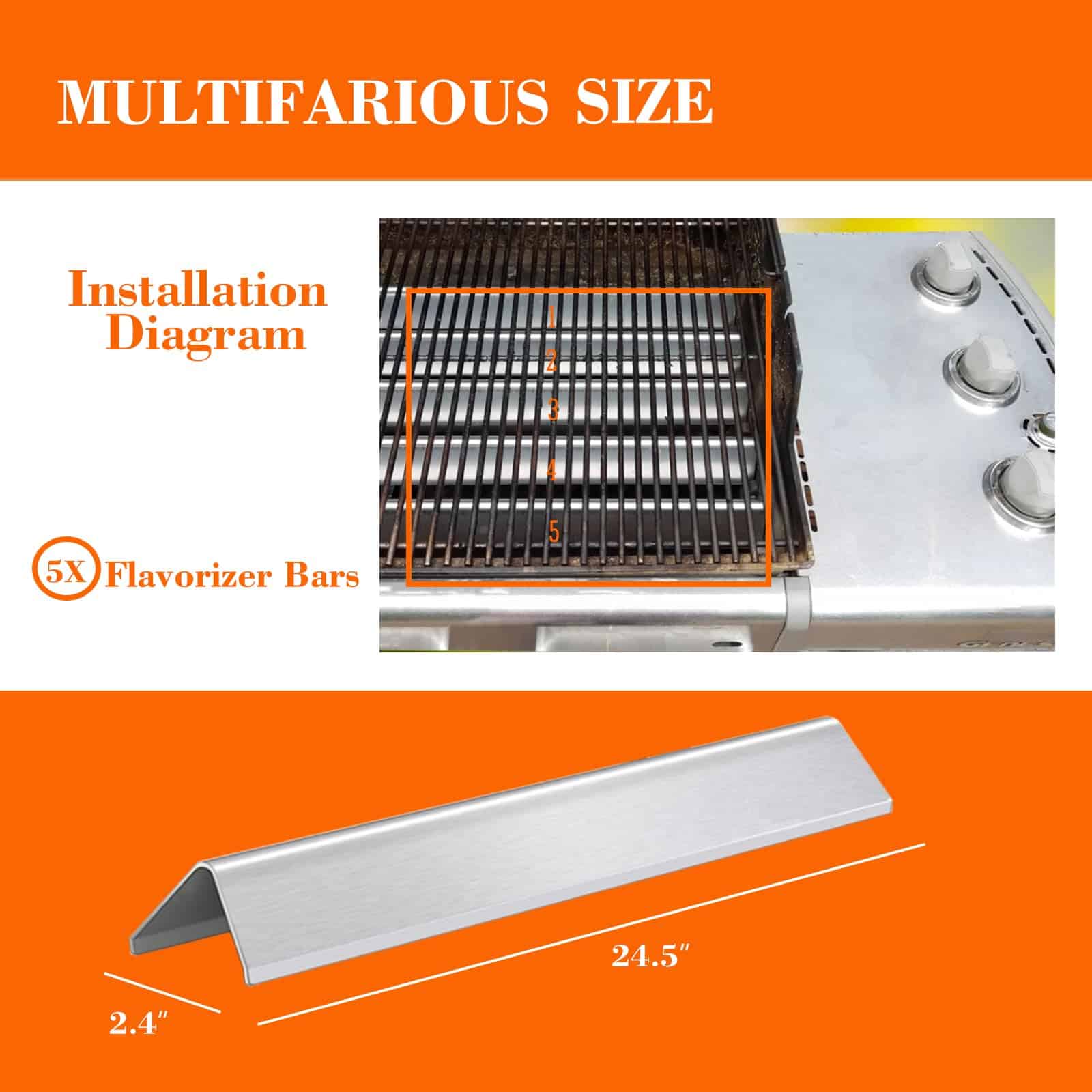 1. Dimensiones de cada barra: 24.5″L x 2.375″W x 2.375″H, juego de 5 barras de acero inoxidable. Asegúrese de que el tamaño coincida con sus piezas originales.