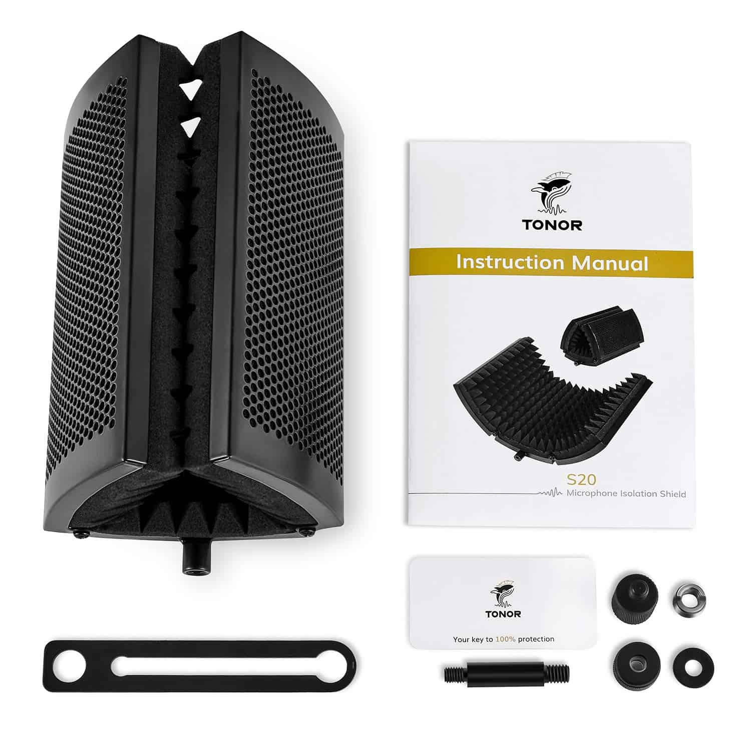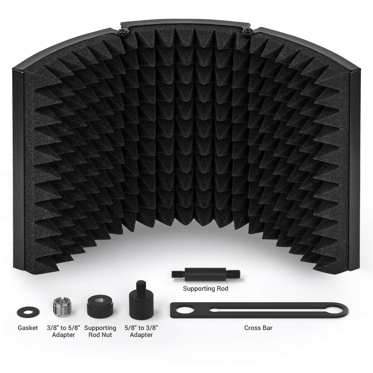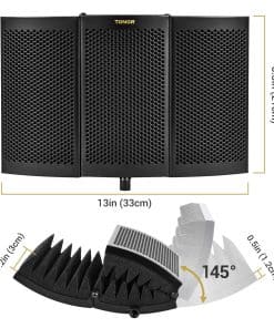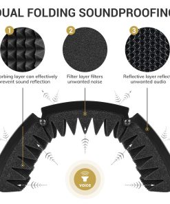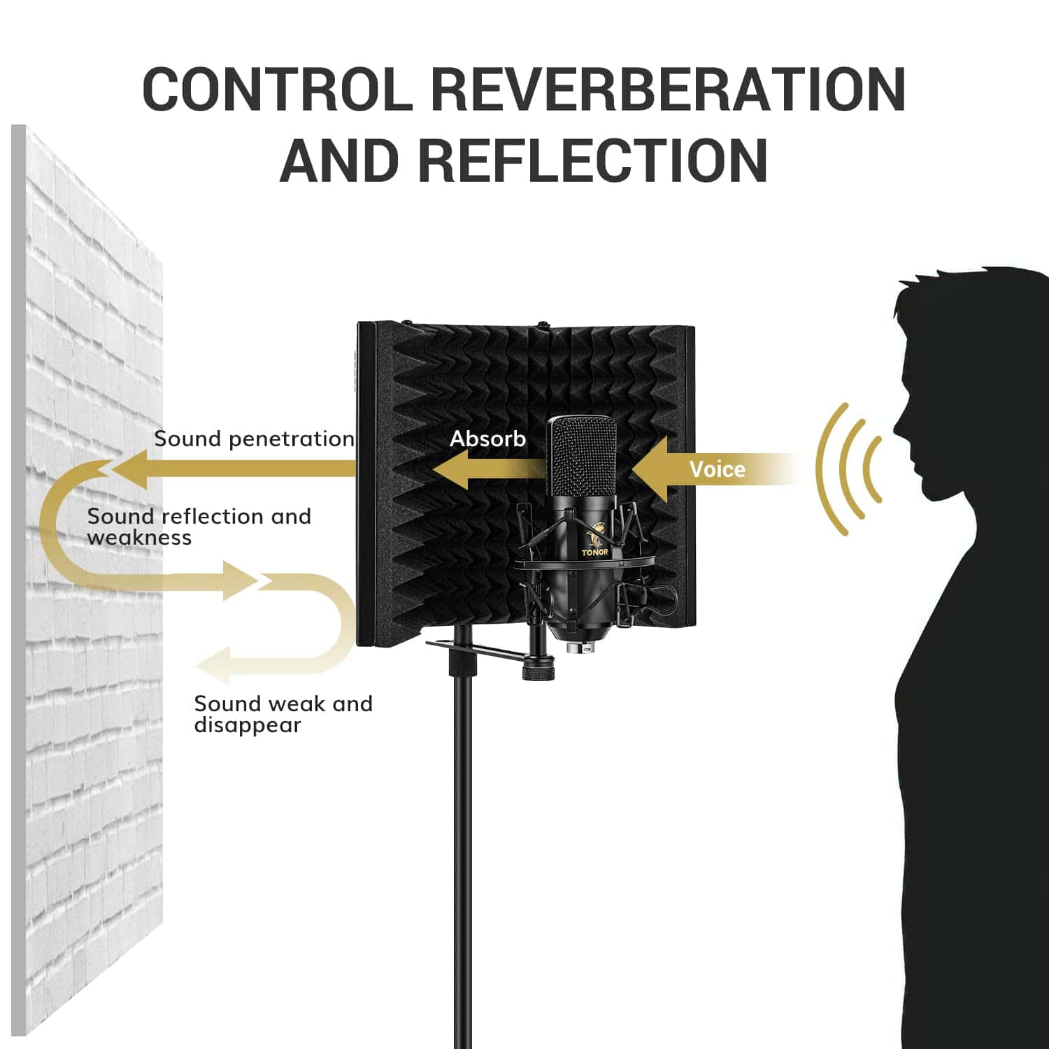 TONOR Micrófono Pantalla de Aislamiento cuenta con aislamiento de espuma absorbente para reducir la reflexión del sonido, y para ayudarte a lograr un sonido más nítido y limpio al grabar.