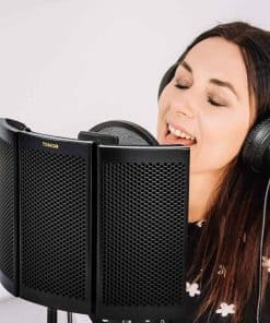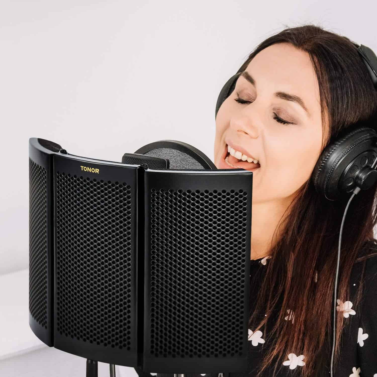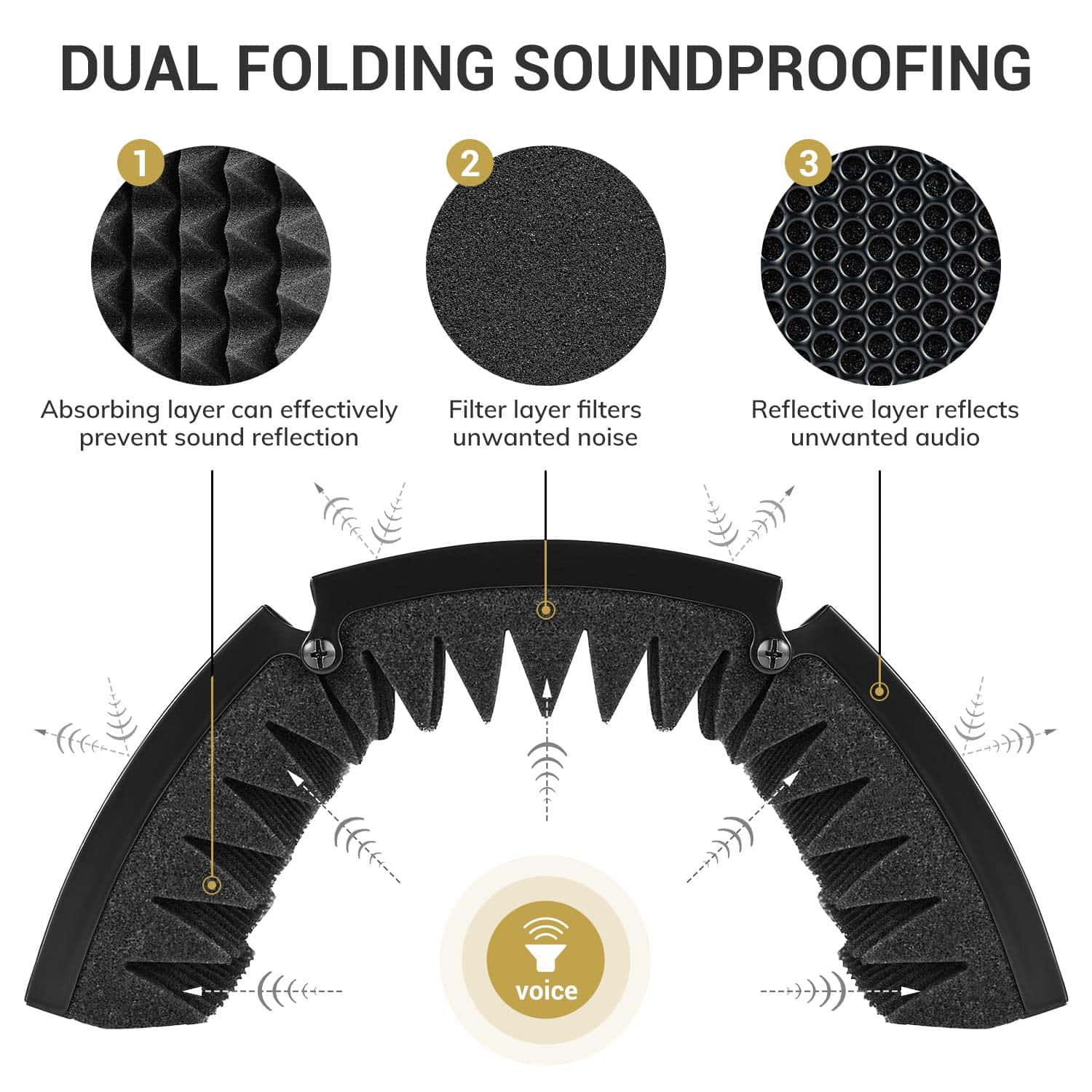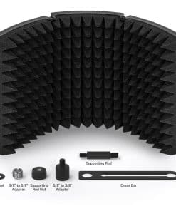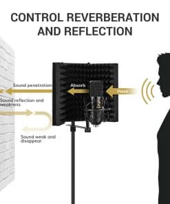 TONOR Micrófono Pantalla de Aislamiento cuenta con aislamiento de espuma absorbente para reducir la reflexión del sonido, y para ayudarte a lograr un sonido más nítido y limpio al grabar.