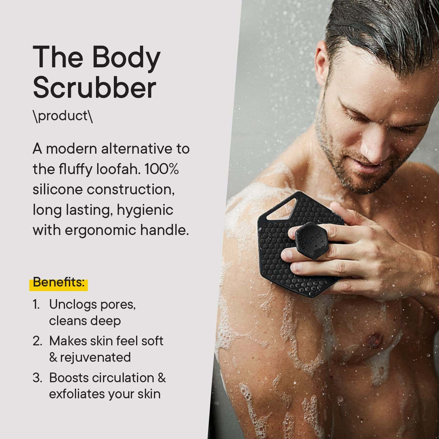 3. ¡Hazte una exfoliación! Para empezar, añade tu gel de baño favorito directamente en las cerdas de silicona hechas a medida de esta esponja de ducha para hombres, agarra el manejo ergonómico y ponte a frotar. Te sentirás rejuvenecido/a tanto que podrías olvidarte de lavarte detrás de las orejas.