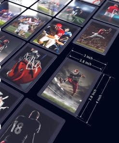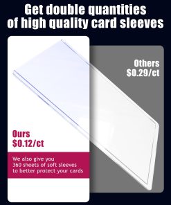 Descripción del Producto: Ofrecemos un set de 360 fundas de tarjetas de plástico duro premium y 360 fundas de tarjetas suaves, cada top loader mide 3″ x 4″ por fuera y 2.8″ x 3.8″ por dentro, que se adaptan a la mayoría de las cartas de colección.