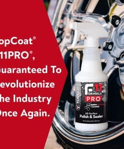 TopCoat F11PRO es un esmalte y sellador todo en uno diseñado para brindar protección y brillo a una variedad de superficies tanto en exteriores como en interiores. Gracias a su tecnología amino-funcional, F11PRO es capaz de crear un recubrimiento superior a otros productos similares. Este producto es ideal para mantener la apariencia de tus vehículos y protegerlos contra los elementos y la suciedad cotidiana. Con una sola aplicación, F11PRO puede durar hasta 12 meses, ofreciendo una protección duradera y un brillo brillante. Es fácil de aplicar y se recomienda utilizar un paño de microfibra para obtener los mejores resultados. Con F11PRO, puedes mantener tus autos, motocicletas, camiones, RVs y más en óptimas condiciones durante más tiempo.
