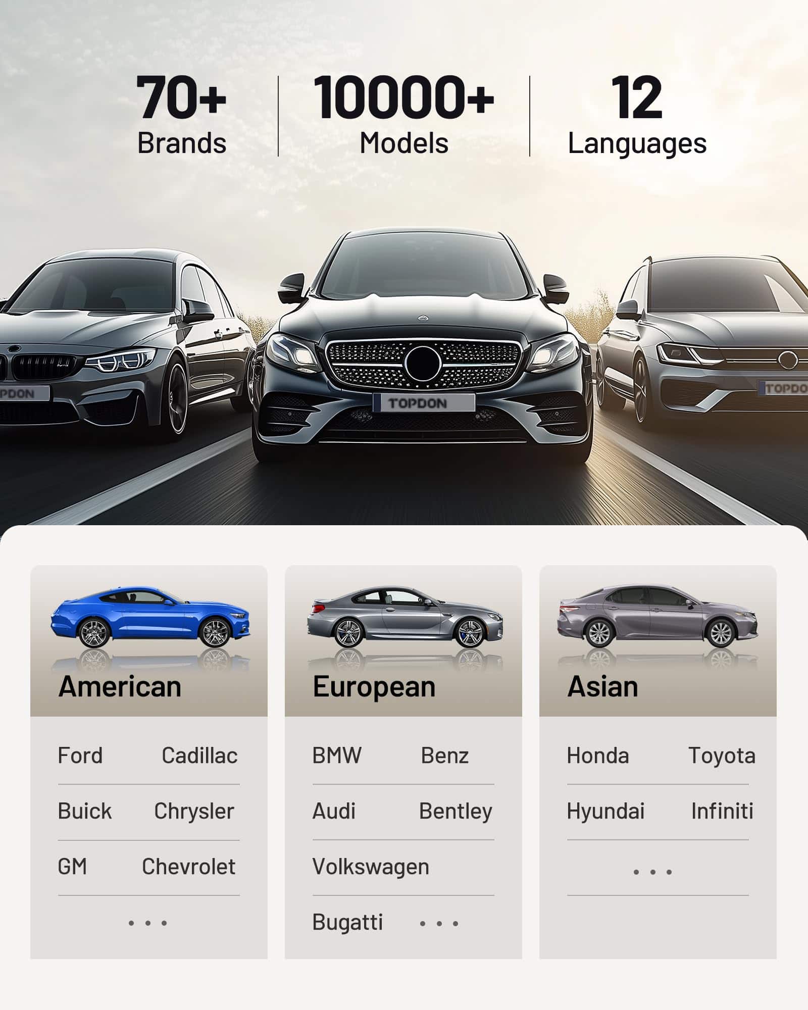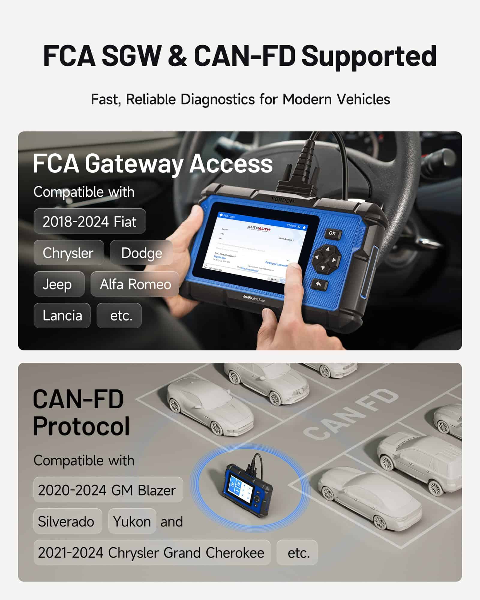 Con una amplia cobertura de vehículos que abarca más de 70 marcas y 10,000 modelos, el AD600 Elite es la herramienta de diagnóstico de automóviles ideal. Con acceso a FCA Gateway, puedes realizar diagnósticos completos en vehículos más nuevos, como los modelos Chrysler, Jeep, Dodge y Fiat a partir de 2017. Además, compatible con el protocolo CAN-FD, funciona con modelos de 2024 como el Blazer de GM y la serie CT de Cadillac, y el Grand Cherokee y Grand Wagoneer de Chrysler.