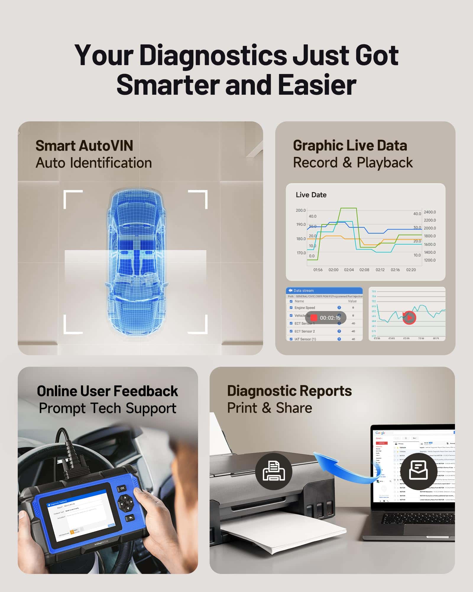La funcionalidad inteligente del ArtiDiag600 Elite incluye la función AutoVIN, que lee rápidamente el VIN del automóvil para brindar información precisa al instante. Monitoriza el rendimiento del vehículo con datos en tiempo real y compara hasta cuatro flujos de datos simultáneamente para identificar problemas. Genera informes profesionales detallados y compártelos fácilmente por correo electrónico o código QR una vez que los diagnósticos estén completos.