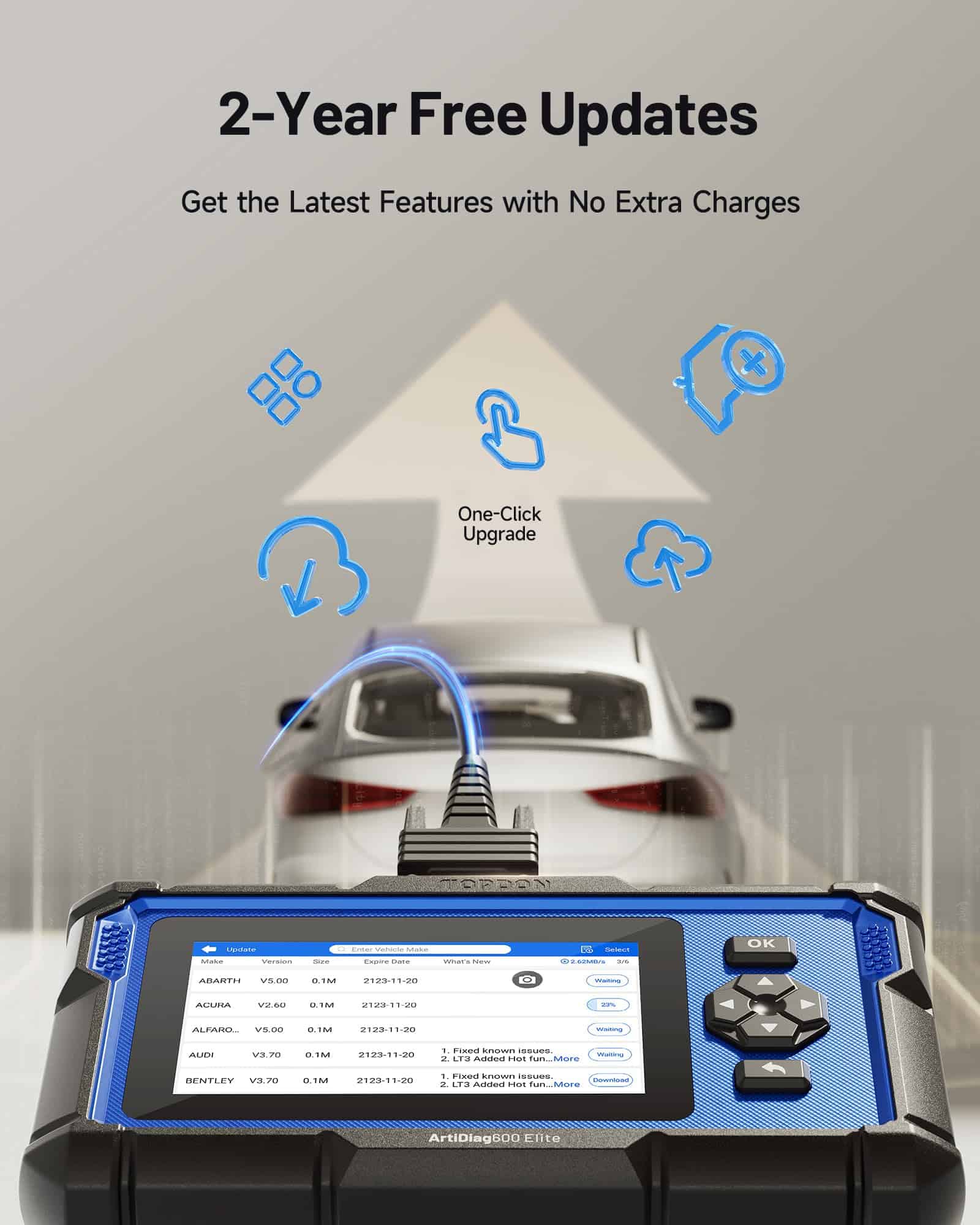 Además, con 2 años de actualizaciones de software y cobertura de vehículos gratuitas, junto con una garantía de 1 año, puedes confiar en el ArtiDiag600 Elite para mantener tu vehículo en óptimas condiciones. Si necesitas ayuda, nuestro servicio de atención al cliente está disponible las 24 horas del día, los 7 días de la semana para responder tus preguntas y brindar asistencia cuando la necesites. Con TOPDON ArtiDiag600 Elite, nunca te quedarás solo en tus diagnósticos de vehículos.