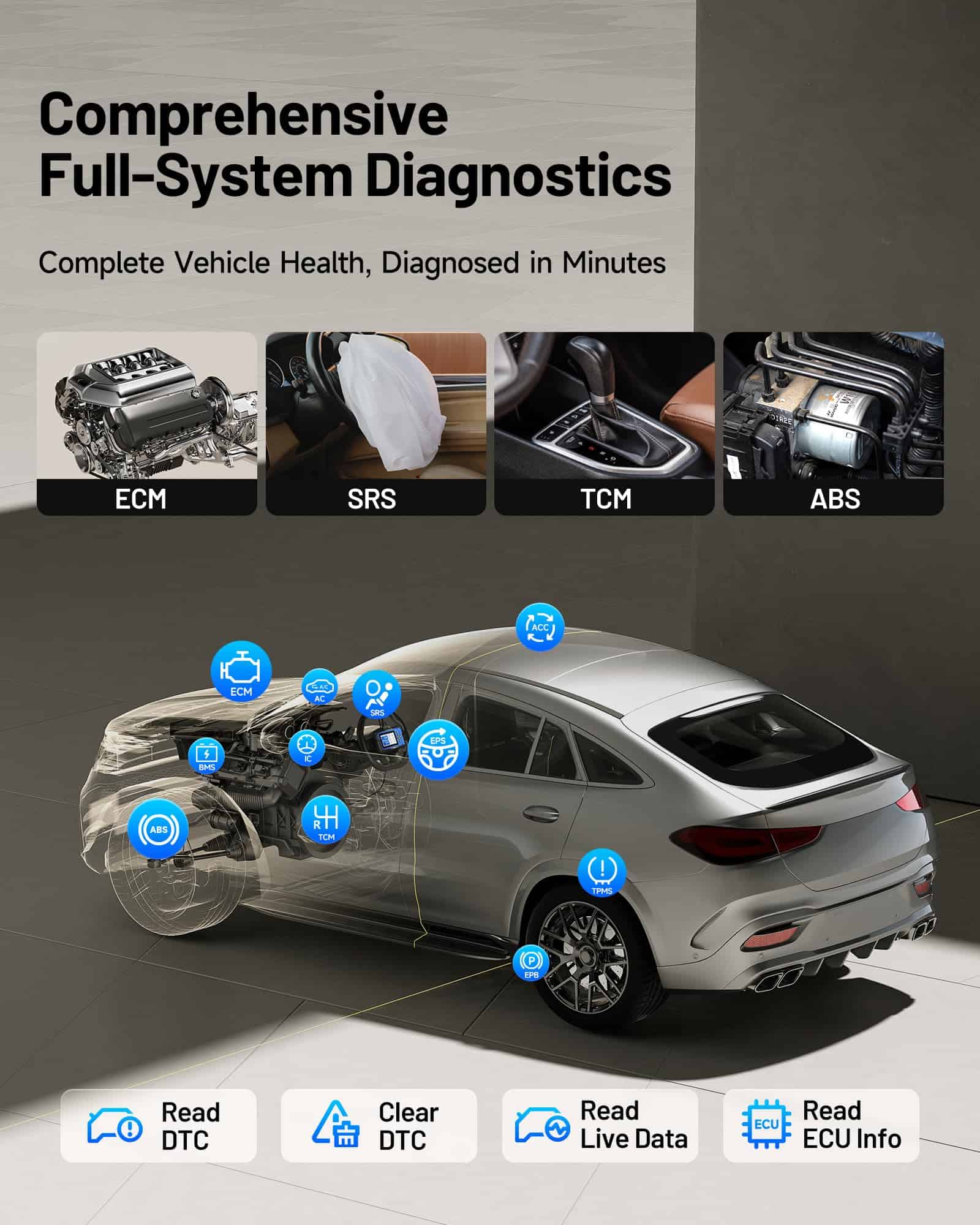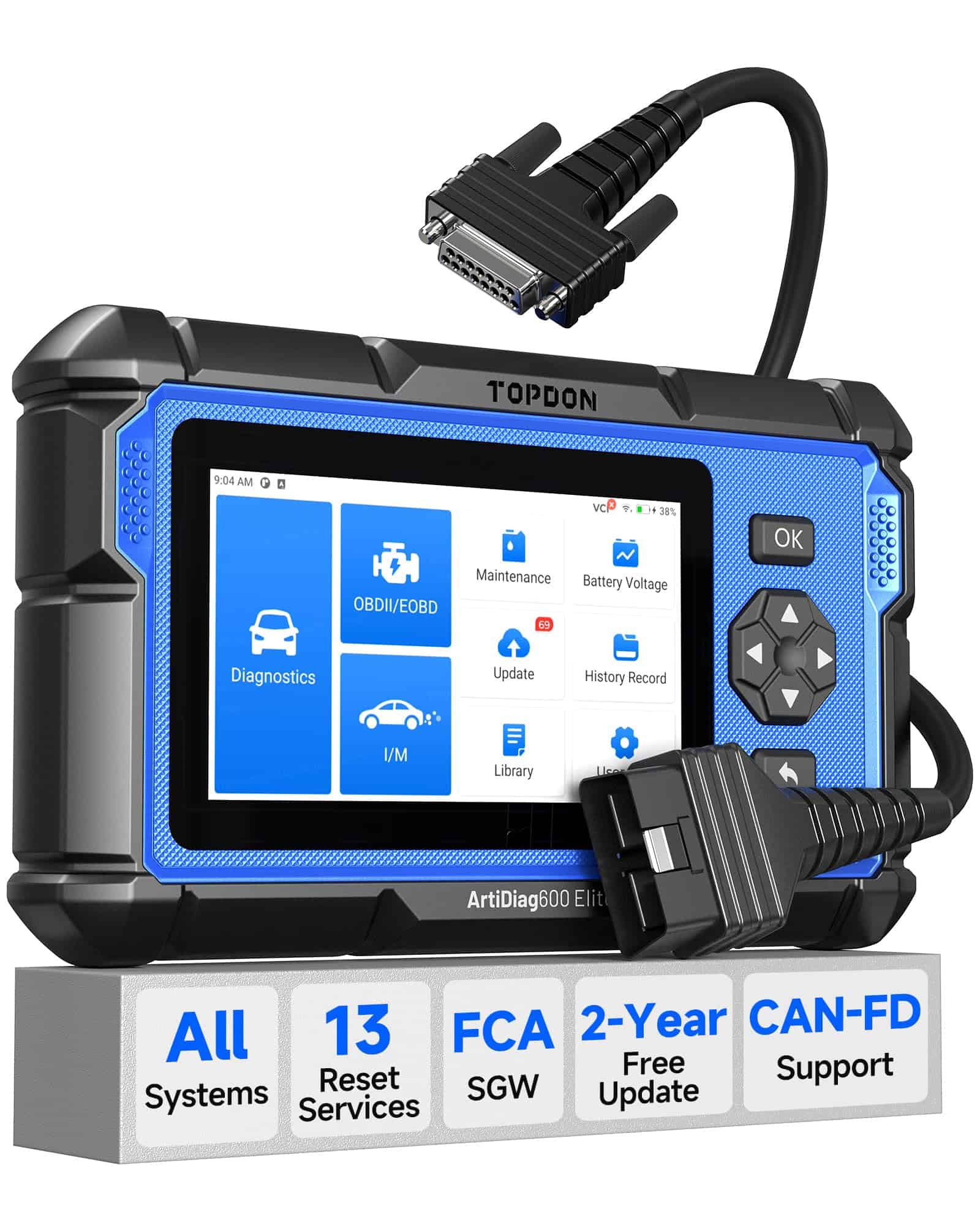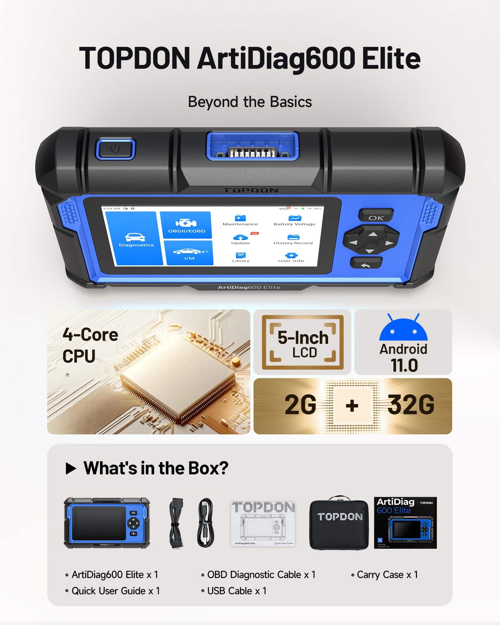 TOPDON ArtiDiag600 Elite es un escáner OBD2 de alta calidad que ofrece diagnósticos completos de vehículos a un precio accesible. Con la capacidad de realizar un escaneo de diagnóstico de sistema completo, este escáner cubre todos los sistemas del vehículo, incluidos el motor, ABS, TCM, SAS, TPMS y SRS, con velocidad y precisión. Además de leer y borrar códigos de diagnóstico, el ArtiDiag600 Elite también permite analizar datos en tiempo real y acceder a la información del ECU, todo desde una sola herramienta asequible.