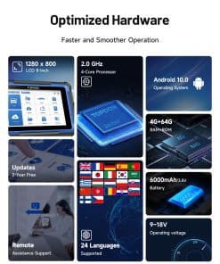 1. ROBUSTEZ EN EL HARDWARE PARA UNA OPERACIÓN MÁS SUAVE: Con Android 10.0 y un procesador de 4 núcleos a 2.0GHz, esta herramienta de diagnóstico de ECU Phoenix Nano ofrece diagnósticos eficientes con un rendimiento ultra rápido. Su batería de larga duración de 6000mAh garantiza una operación continua sin interrupciones. Con 4GB de RAM y 64GB de almacenamiento, ofrece un amplio espacio para el almacenamiento de datos. La pantalla táctil de 8 pulgadas y 1280×800 proporciona una visualización clara, haciendo los diagnósticos más rápidos e intuitivos.