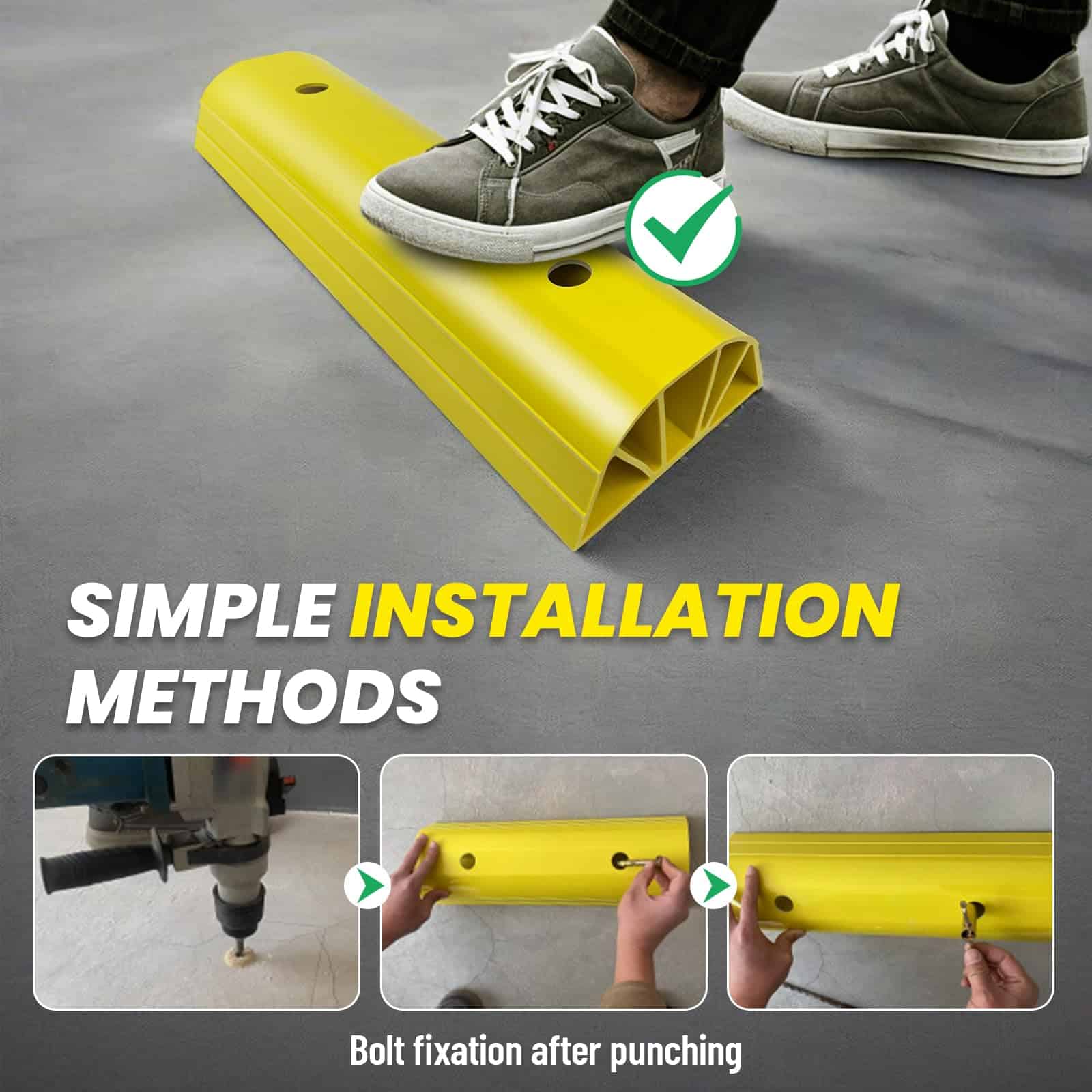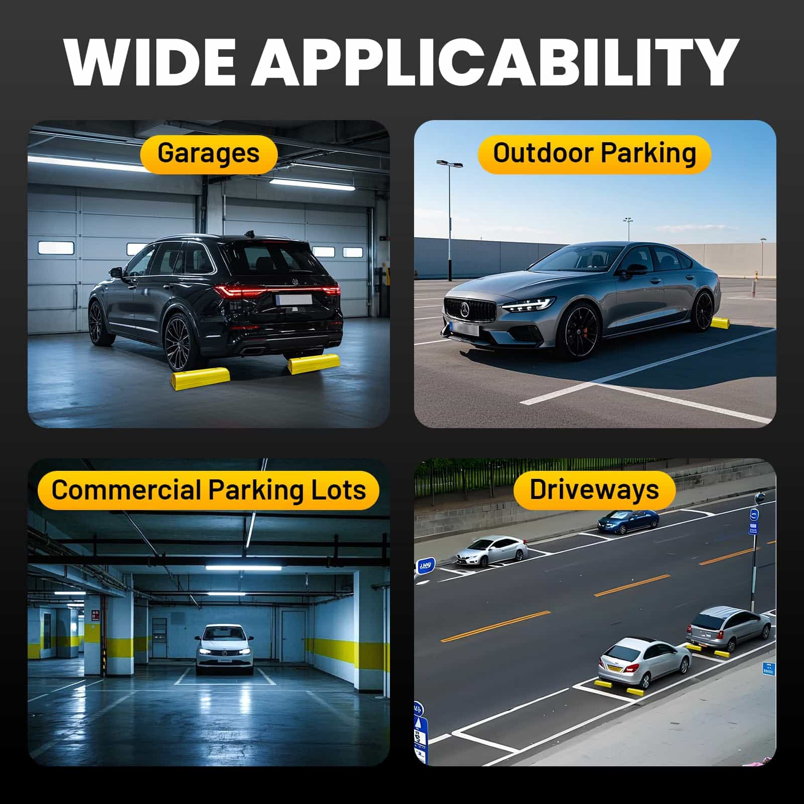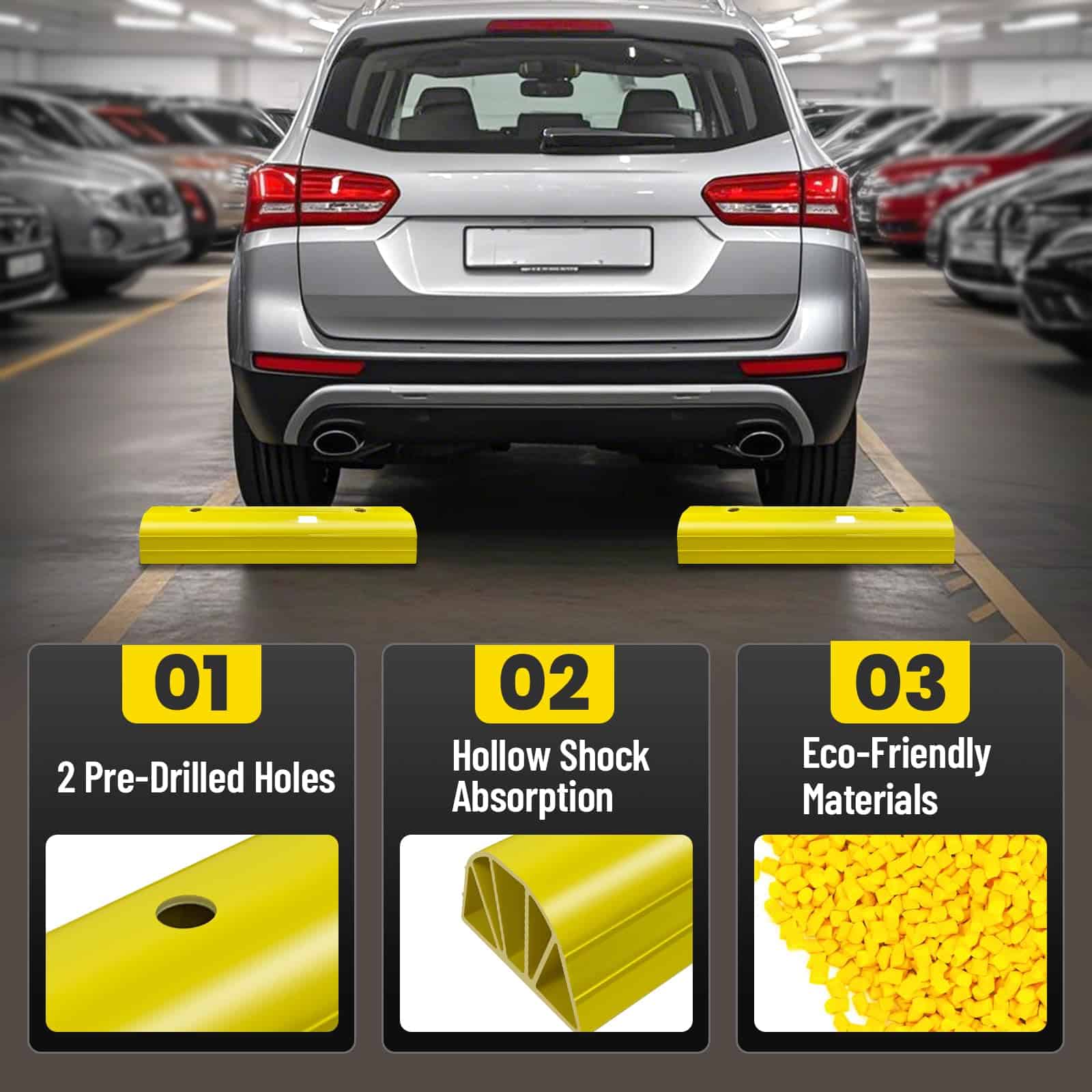 Tope de Estacionamiento ROBLOCK de 22″ para Casa y Exterior, Topes de Garaje Resistentes para Proteger su Vehículo, Ayudas de Estacionamiento para Conductores Nuevos, Topes para Ruedas de Coches, Vans, Remolques, 2 Paquetes, Amarillo. La altura de 3.1 pulgadas garantiza que no rodará accidentalmente sobre el bloque de estacionamiento, permitiendo a los conductores novatos estacionar con precisión y evitando golpear las paredes del garaje. Su longitud de 22 pulgadas se adapta fácilmente a la mayoría de los tamaños de neumáticos ocupando un espacio mínimo en el suelo. El color amarillo brillante mejora la visibilidad, facilitando su identificación incluso en condiciones de poca luz, lo que reduce la posibilidad de tropezar. Los bordes redondeados reducen el riesgo de lesiones durante encuentros accidentales con las ayudas de estacionamiento. Los agujeros pre-perforados permiten una instalación sencilla. Viene con 4 tornillos en el set. Nuestro tope de estacionamiento está hecho de materiales ecológicos que no emiten olores desagradables. Es lo suficientemente resistente para soportar impactos de vehículos sin romperse fácilmente, siendo apto para vehículos pesados como autocaravanas, remolques y camiones. El tope de estacionamiento para garaje ROBLOCK resistente a la intemperie se desempeña bien en entornos exteriores, ya sea en un garaje, entrada o en otros espacios de estacionamiento al aire libre. Si tiene alguna pregunta sobre los topes de estacionamiento para garaje, estaremos encantados de ayudar.