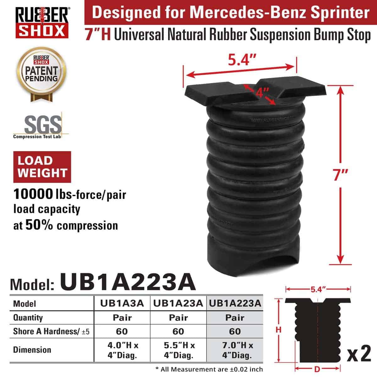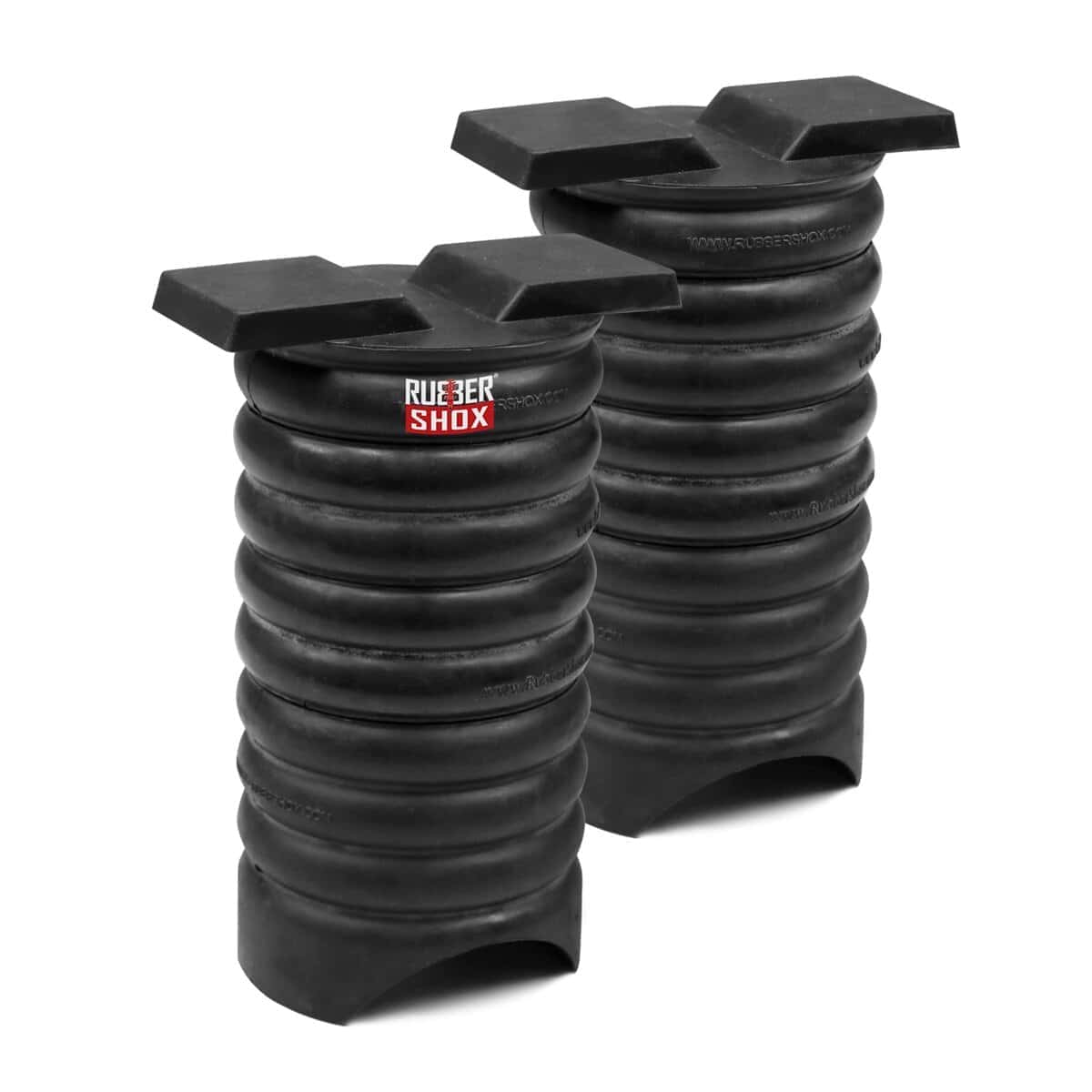 Topes de goma universales RubberShox. Es un amortiguador de topes de goma de goma natural para el sistema de suspensión delantero/trasero de camiones o vehículos recreativos (RV). Un soporte de suspensión de topes de goma de goma natural sin mantenimiento. Mientras suave contacto inicial y luego aumentar en rigidez linealmente. Ofrecen una mayor estabilidad de conducción, carga pesada, rendimiento off-road y confort de conducción mejorado mientras se extiende la vida útil operativa de la suspensión vehicular. Capacidad de carga de 4500/9000 libras-fuerza por pieza/par al 50% de compresión.