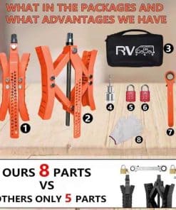 RVPNR217R Topes de rueda estabilizadores para RV, topes x para remolques de viaje, Topes para neumáticos de remolque de rv (2 paquetes) con trinquete, llave de vaso y cerraduras de contraseña, Rojo. Hecho de hierro resistente y duradero para mejorar la firmeza y estabilidad. Incluye bolsa de almacenamiento, 2 topes estabilizadores, 1 llave hexagonal, 1 trinquete, 2 cerraduras de contraseña (no se requiere llave) y guantes. Ajuste rápidamente el tope de la rueda con la llave hexagonal, reduciendo tiempo y esfuerzo.