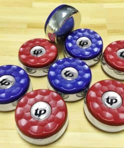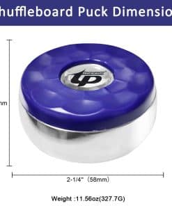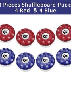 Conjunto de 8 pucks de shuffleboard – 4 rojos y 4 azules. Medida de 2-1/4 pulgadas de diámetro. Tapa de ABS con acero cromado pesado. Pucks probados en peso y velocidad para consistencia. Incluye tapas de repuesto.