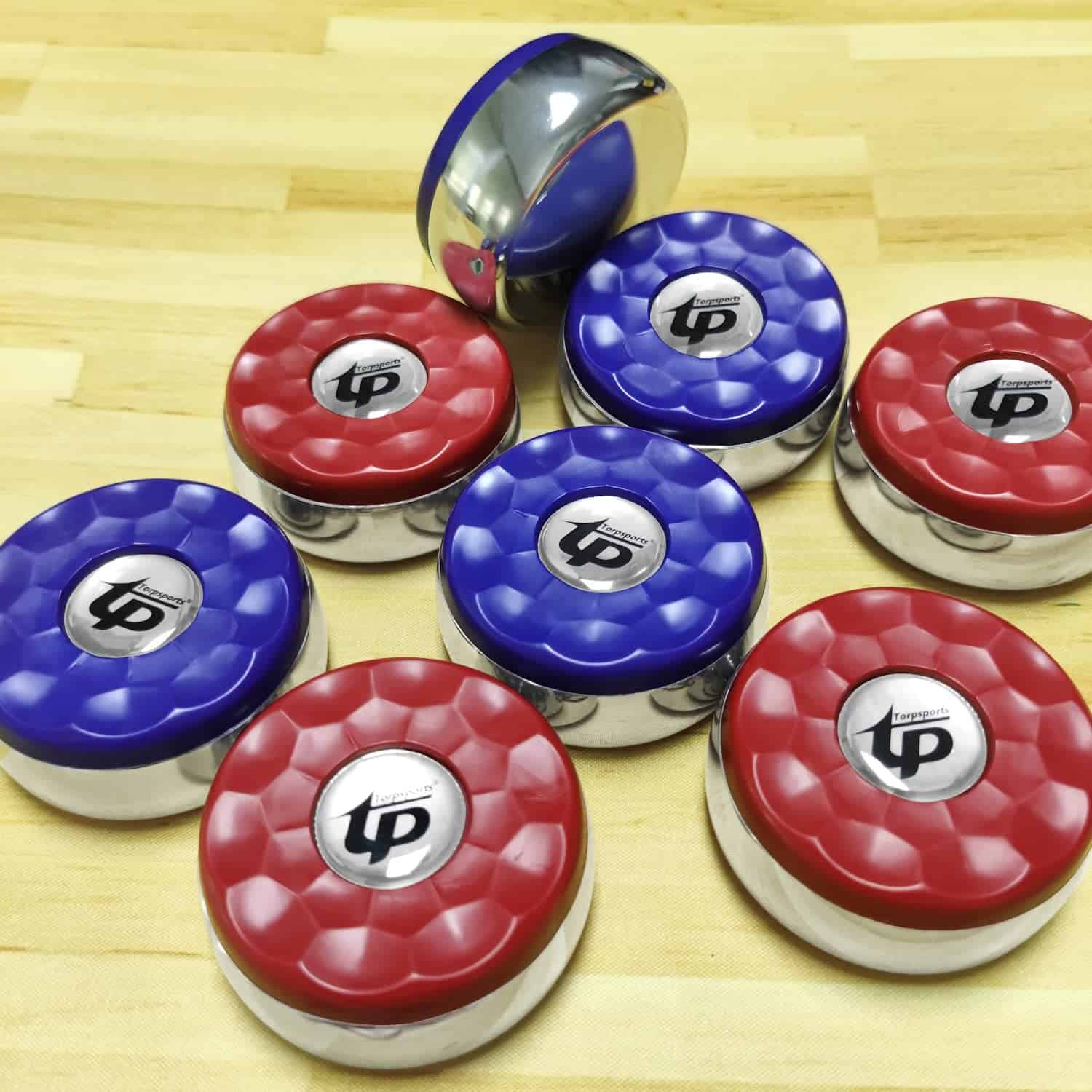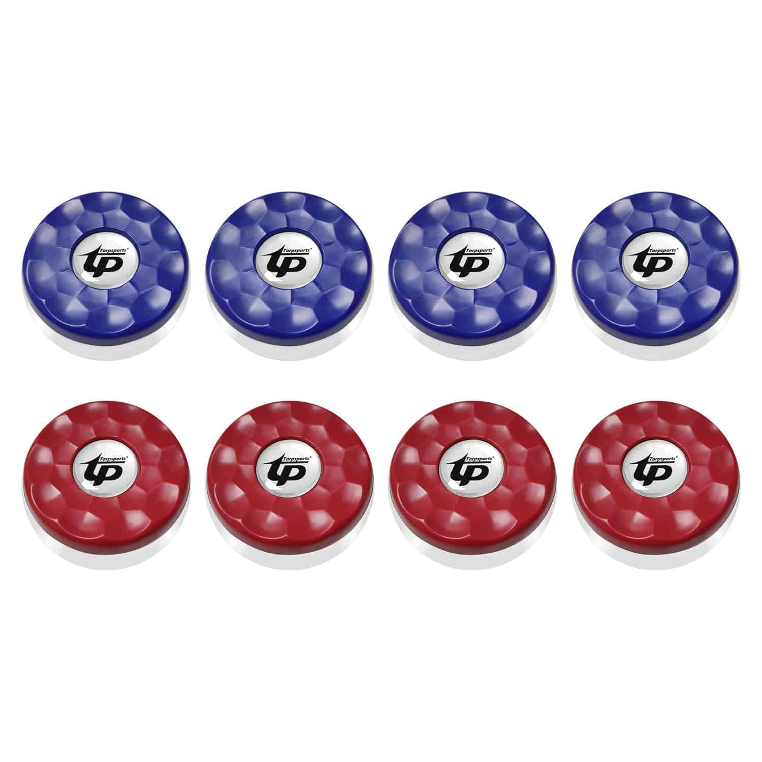 Conjunto de 8 pucks de shuffleboard TORPSPORTS. Incluye 4 pucks rojos y 4 pucks genéricos azules. Tamaño: 2-5/16 pulgadas. Fabricados en acero cromado pesado con tapas de ABS. Los pucks han sido probados en peso y velocidad para asegurar consistencia. Además, se incluyen tapas de repuesto para un mayor durabilidad y mantenimiento del juego.