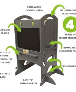 Haz que jugar en altura sea divertido y seguro con la Torre de Aprendizaje Pintada de Little Partners – Edición Limitada aprobada para niños. Este taburete y centro de juegos todo en uno está especialmente diseñado para niños y viene en una variedad de opciones de acabado. El barandal de cuatro lados evita caídas peligrosas o resbalones en el taburete, pero a medida que su hijo envejece y se vuelve más seguro, puede retirar los lados y ajustar la altura de la plataforma. Una pizarra incorporada mantiene a los niños ocupados durante todo el día. Dimensiones: 33W x 23D x 38H pulgadas. Hecho de pino de alta calidad con acabado natural. Disponible en la opción de acabados de tu elección. El taburete seguro para niños no se volcará. 4 paneles laterales extraíbles para evitar caídas. Empújalo hasta el mostrador o fregadero. La altura de la plataforma se ajusta a medida que tu hijo crece. También cuenta con pizarra y borrador adjunto. Recomendado para niños de 18 meses a 6 años. Requiere ensamblaje.