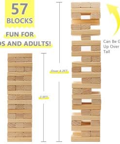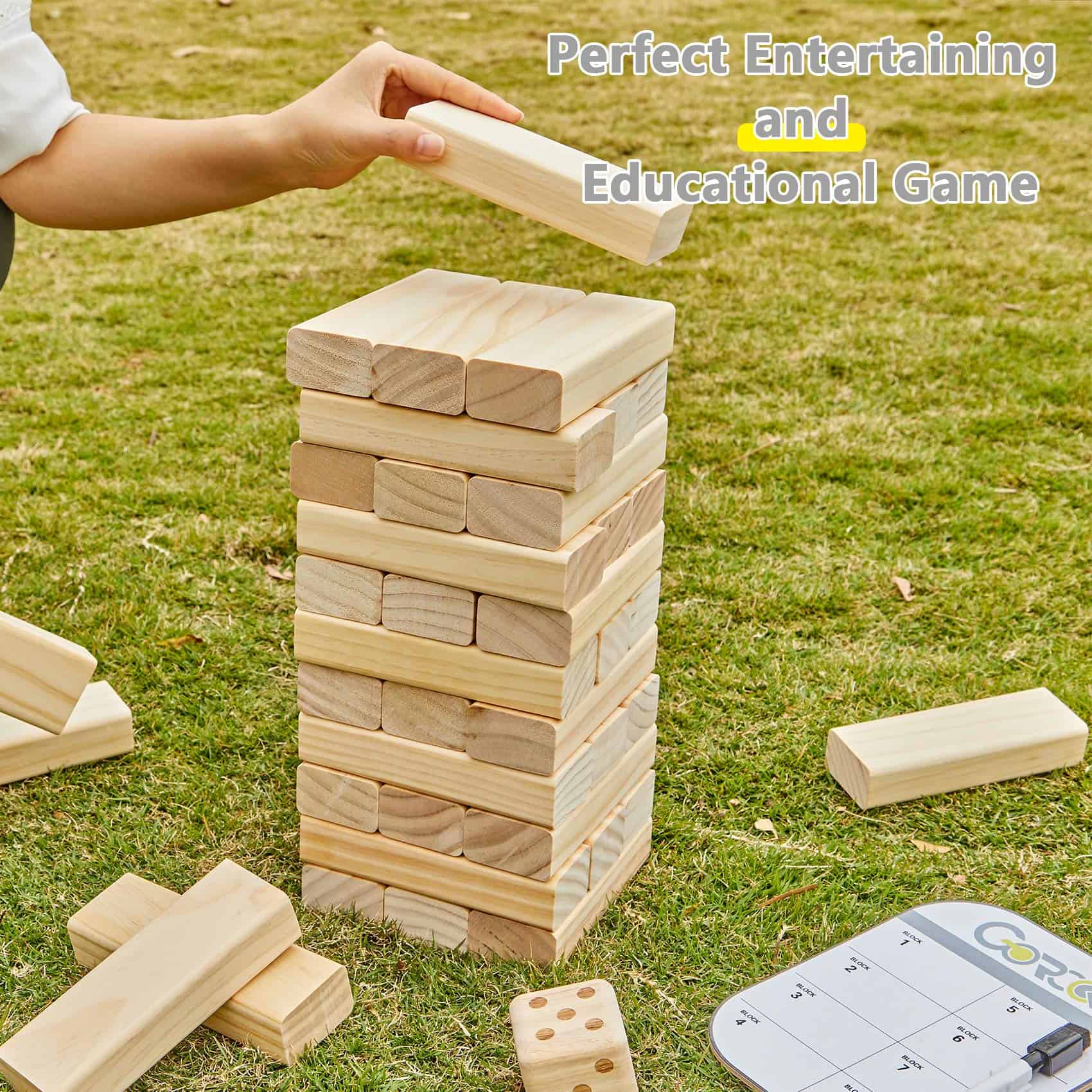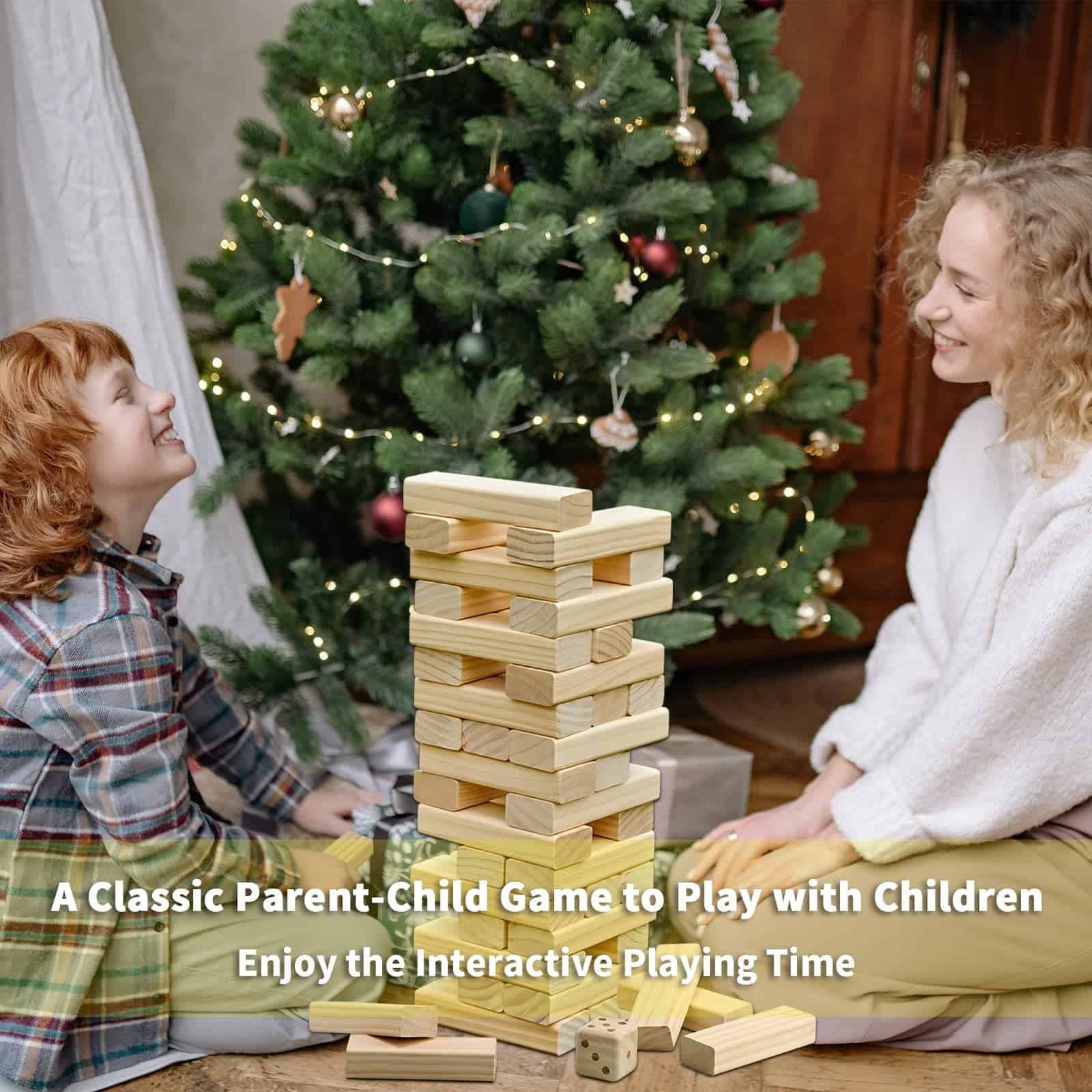 El juego de apilamiento gigante para interiores y exteriores está hecho de madera de pino de Nueva Zelanda, sin pintura, sin plomo, no tóxica ni dañina para el cuerpo humano. Los bloques gigantes están elaboradamente biselados y pulidos sin rebabas ni aristas. Las facetas lisas y bordes redondeados garantizan una extracción segura y sin esfuerzo. El clásico juego de bloques de madera familiar prueba tanto la fuerza física como mental, enseñando a los niños cómo estrategiar, equilibrar y perfeccionar sus habilidades motoras finas. ¡Haz que toda la familia participe en una diversión super! Los padres pueden unirse y disfrutar del tiempo de juego interactivo con los niños. También puede ser una opción de juegos de interiores y exteriores durante el tiempo libre. Una bolsa de transporte conveniente hace que este juego de interiores para adultos y familias sea fácil de transportar y almacenar todas las piezas de la fiesta. Cada pieza de bloque encaja perfectamente apilada en la bolsa con cremallera y presenta dos asas que facilitan su transporte.