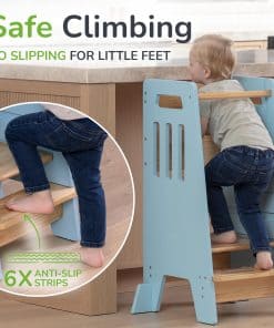 3. ESTABLE Y SEGURO: Nuestra torre para niños pequeños viene con pies de apoyo resistentes y almohadillas protectoras en todos los pies para evitar rayones en el suelo de tu cocina. Además, hemos añadido tiras transparentes a los escalones para asegurar que los pies de tus pequeños no resbalen.