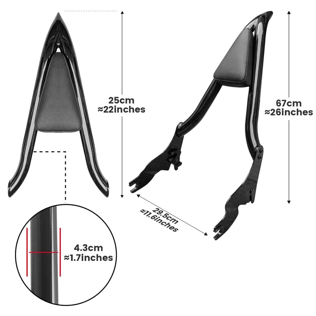 2. Material: Este sissy bar para Harley Davidson está hecho de acero de alta calidad. La superficie de pintura de acero inoxidable se pule de 3 a 5 veces. La estructura de metal pesado puede prevenir la decoloración y fragmentación con el paso del tiempo. El cojín trasero de pasajero negro está hecho de cuero PU impermeable con esponja de alta densidad incorporada.